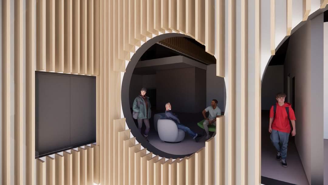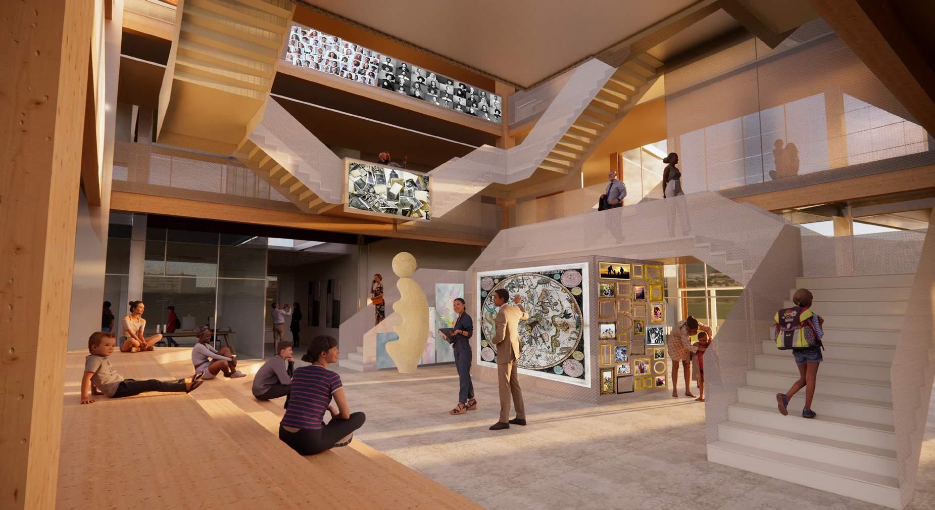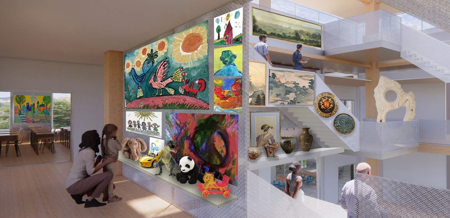 Situated next to a drop-in shelter, this kunsthalle invites in and brings together people from all walks of life into its participatory gallery spaces. Visitors are invited to contribute their own stories and items to the rotating exhibits which then influences the architecture of the building, with the central hearth gathering space beaming with light as a space of safety, inclusion, and warmth.