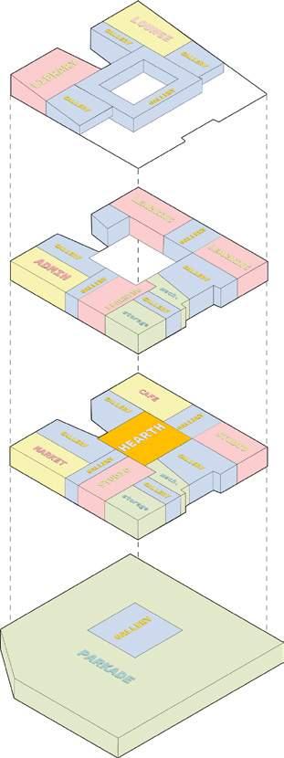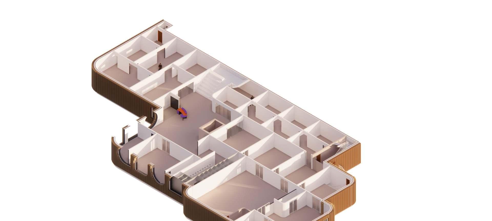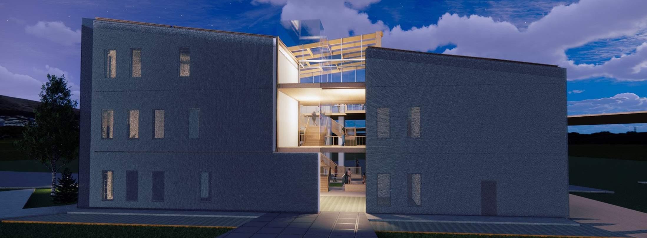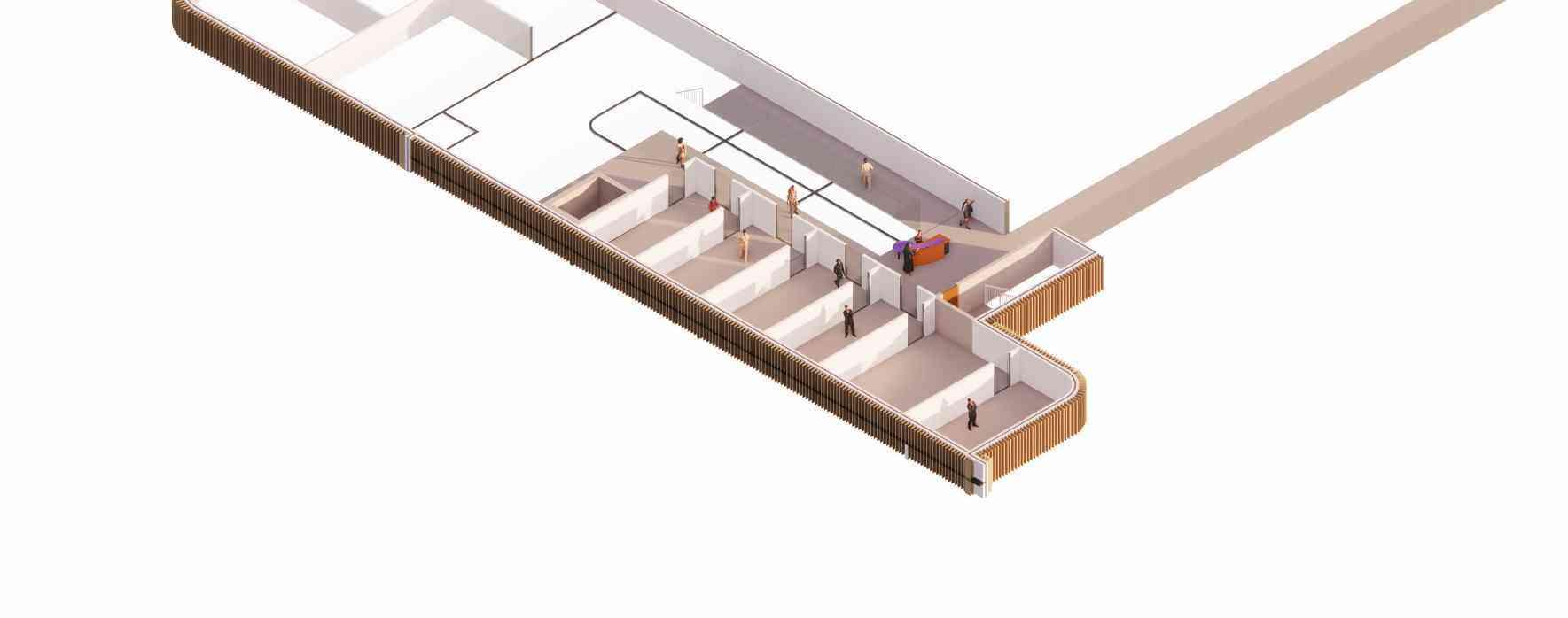 Situated next to a drop-in shelter, this kunsthalle invites in and brings together people from all walks of life into its participatory gallery spaces. Visitors are invited to contribute their own stories and items to the rotating exhibits which then influences the architecture of the building, with the central hearth gathering space beaming with light as a space of safety, inclusion, and warmth.