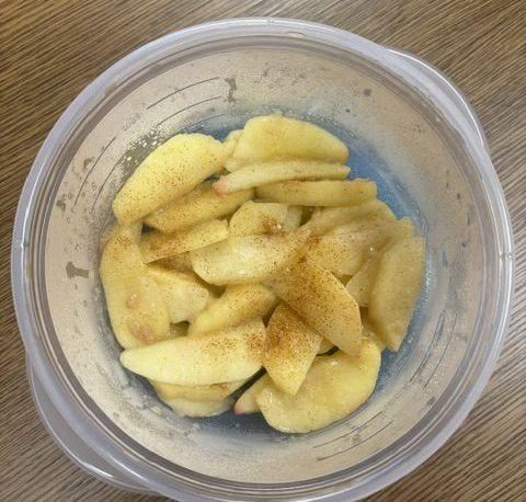 Dusttheappleswithcinnamon andadashofnutmegtoyourliking. Addasprinkleofsalt,asqueezeof lemonjuiceandafewtablespoons ofwater.Tosstheapplestocoat, thensettlethemevenlyinyour dish.