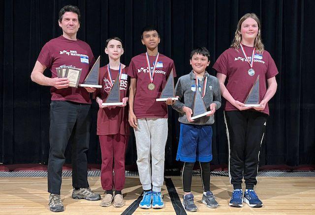 Winners of the New Hampshire State MATHCOUNTS competition held on March 14th at the NHTechnical Institute who will represent New Hampshireat theNationalMATHCOUNTS competitioninOrlando,FL inMay.From lefttoright: CoachTomWhartonof RichmondMiddle School, Rhys Yapof St. John Regional School, Agastya Chakrabarti of Richmond Middle School, Edward Elmore ofCooperative Middle School, Harvey Vale Dwyer of Richmond Middle School.