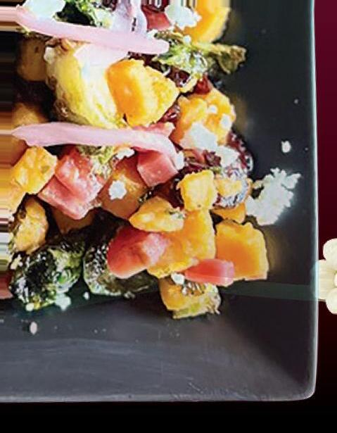 Roasted brussels sprouts, cranberries, beets, and sweet potatoes with whiskey ginger glaze, topped with candied pecans, goat cheese and pickled red onions.