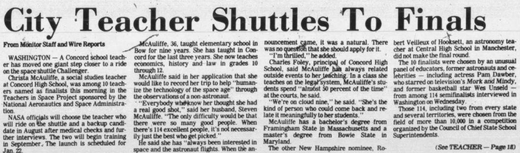 In 1985, when Christa was going through the selection and training processes to become the first teacher in space, my wife and I were in our first year of marriage. Our oldest child wouldn’t be born until the summer of the following year, so we were not yet engaged with Concord s school system or familiar with its teachers. Still, we became caught up in the city s excitement as one of our own competed with more than 11,000 teachers from across the U.S. to become the first teacher in space. Like the rest of Concord, we tracked Christa’s progress and celebrated when she was chosen to ride the Challenger and teach from Earth’s orbit.