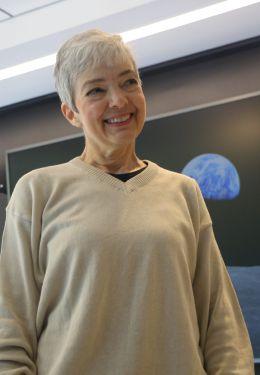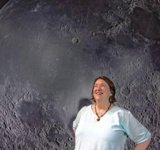 Former Discovery Center director Jeanne Gerulskis in front of the moonscape exhibit at the Christa McAuliffe Planetarium porior to her retirement. Sheled the center afterarriving in New Hampshire in 1997.