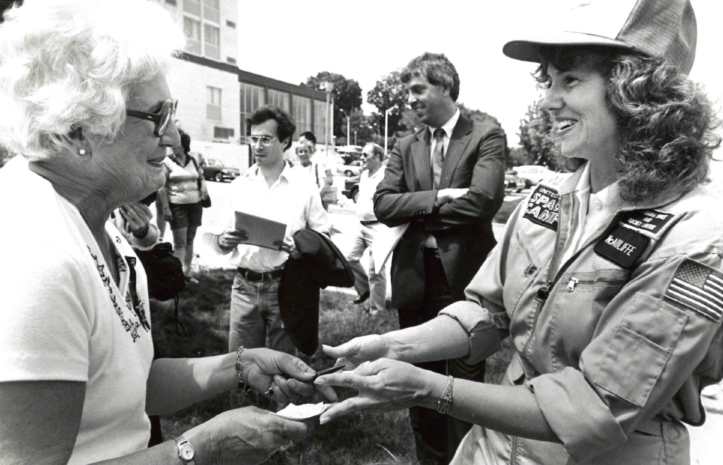 Christa McAuliffe signs an autograph during a visit to Concord after her selection to join the Challenger mission.