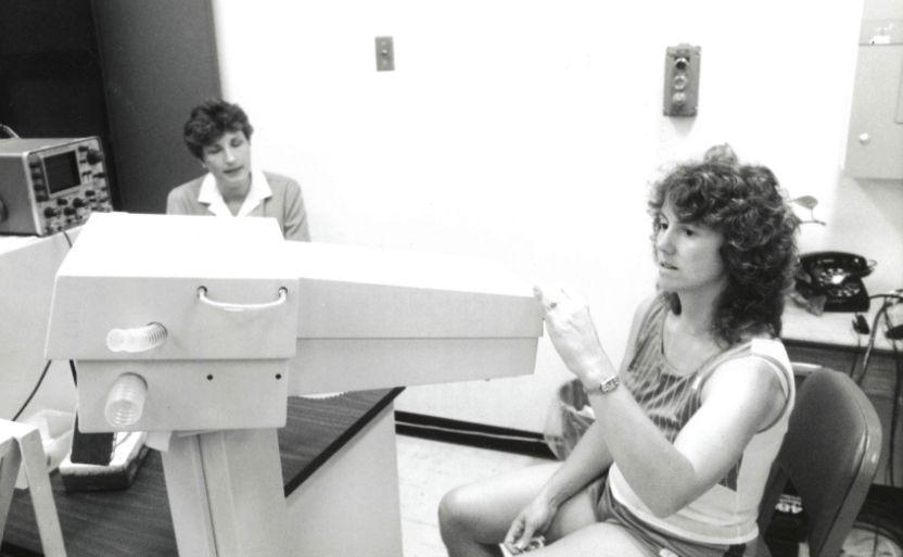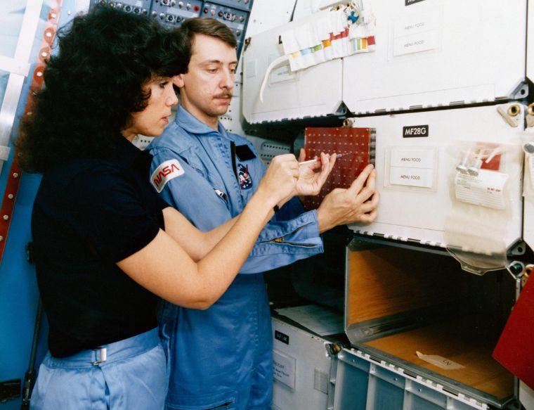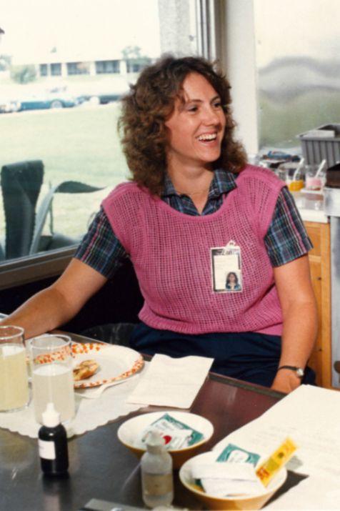 Christa McAuliffe enjoys a meal during training for the Challenger launch in 1985.