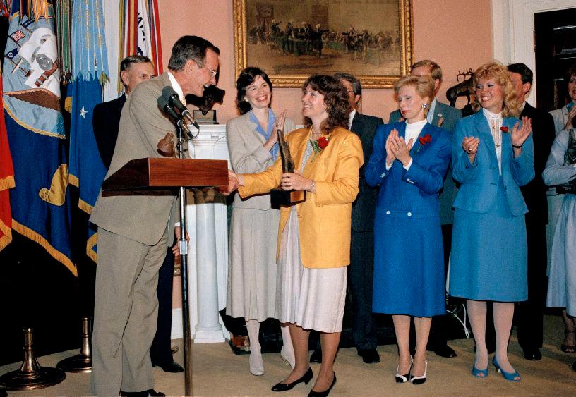 Vice President George Bush shakes hands with Concord High teacher Christa McAuliffe after handingher atrophy,following hisannouncement thatshewas chosenforthe Teacher In Space program on July 19, 1985.