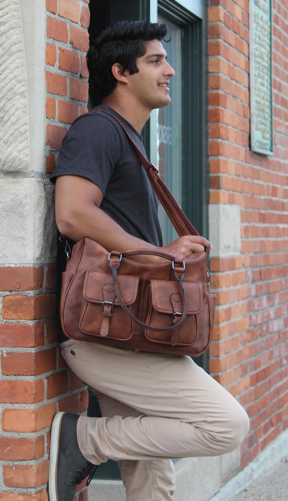 15” W x 11.5” H x 4” D | RFID PROTECTED Vegan leather, padded laptop compartment, multiple pockets for organization, RFIDprotected built-in card slots,canvas-lined.