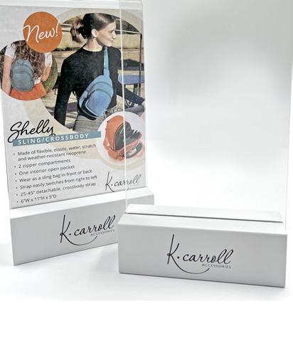 Our display signs come with a branded base and high quality acrylic, customizable frame and product inserts. Perfect for table or shelf displays, or anywhere you display your K•Carroll handbags!