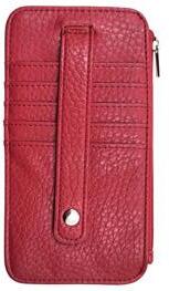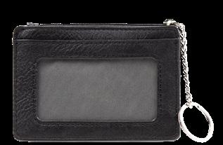 RFID-protected built-in card slots, clear ID slip, full size bill compartment, zipper pockets for coins.