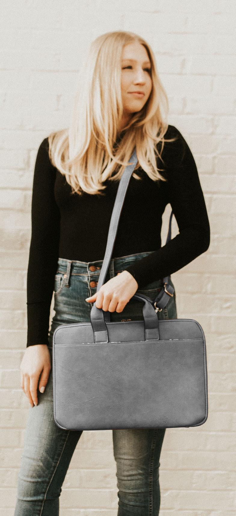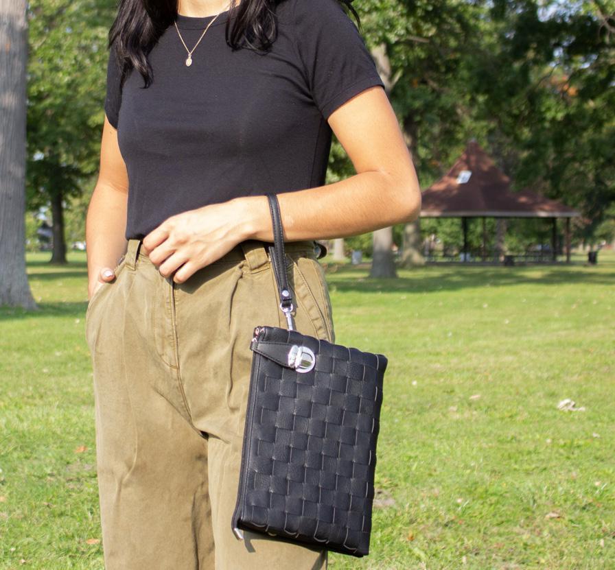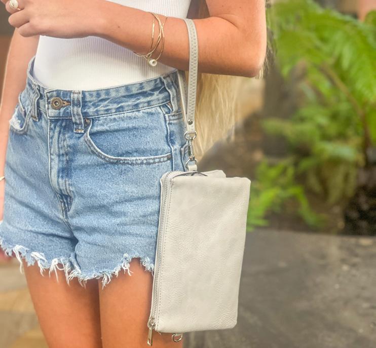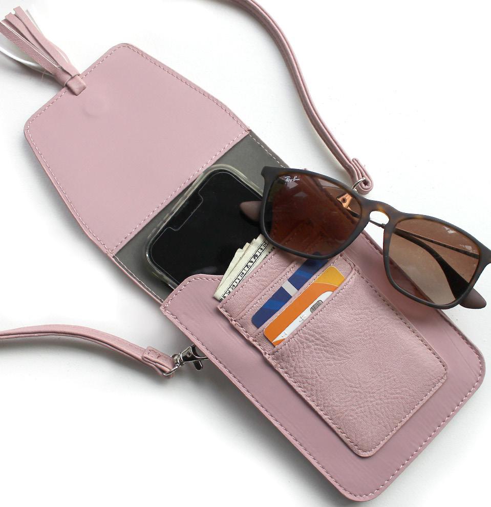The perfect organizer with three separate compartments, including a center zippered compartment. Includes wristlet and two straps: vegan leather and guitar strap (more options on pg.41). Carry a phone, sunglasses, lipstick and more. You can even fit a small wallet, but with four built-in RFID protected card sleeves, you won’t need to! INDIVIDUAL