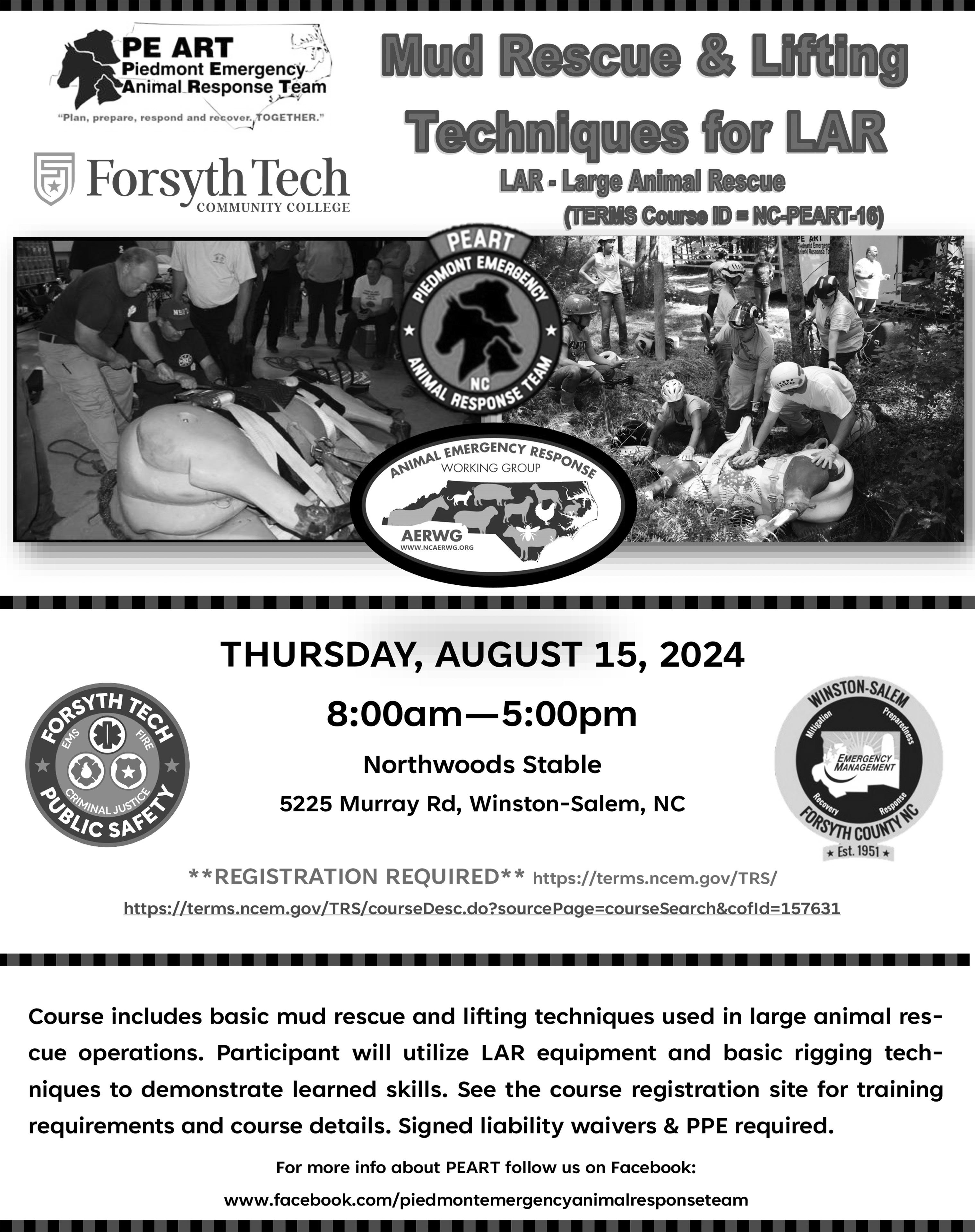 Aug. 15 — Piedmont Emergency Animal Response Team Training Course, Winston-Salem, N.C.