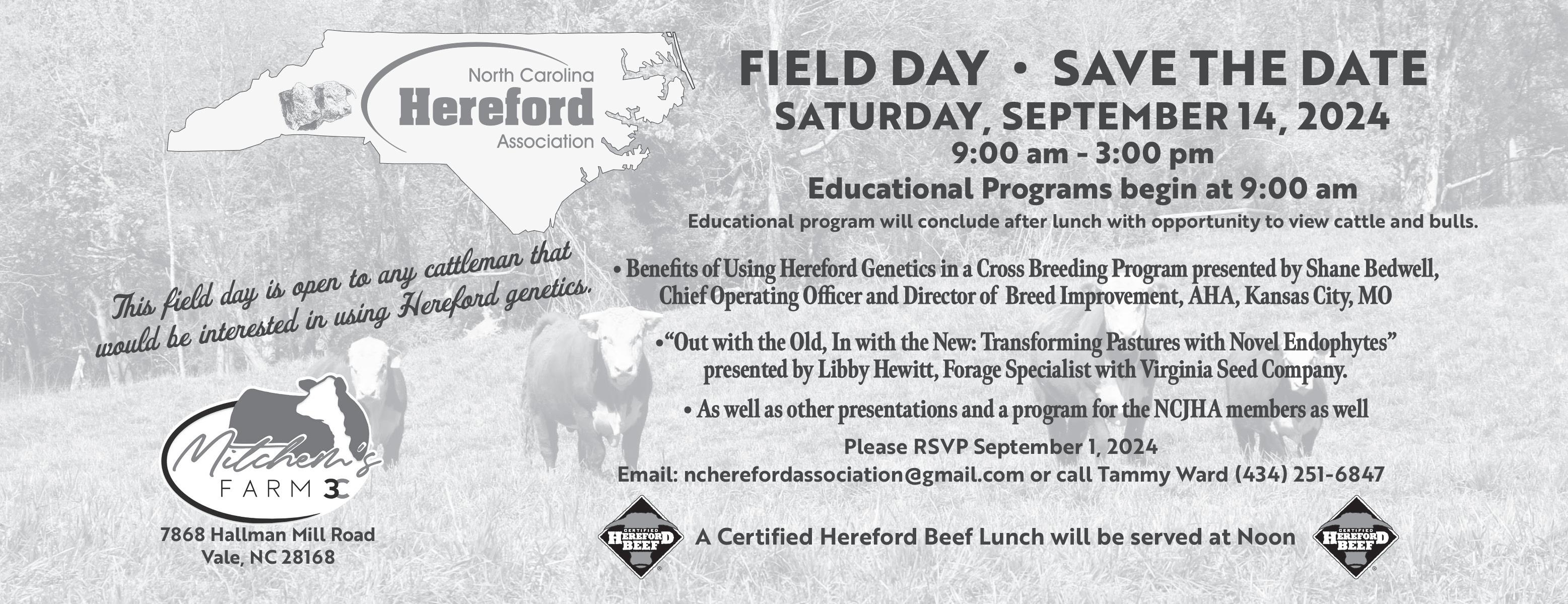 Sep. 14 — N.C. Hereford Association Field Day at Mitchem’s Farm 3C, Vale, N.C.