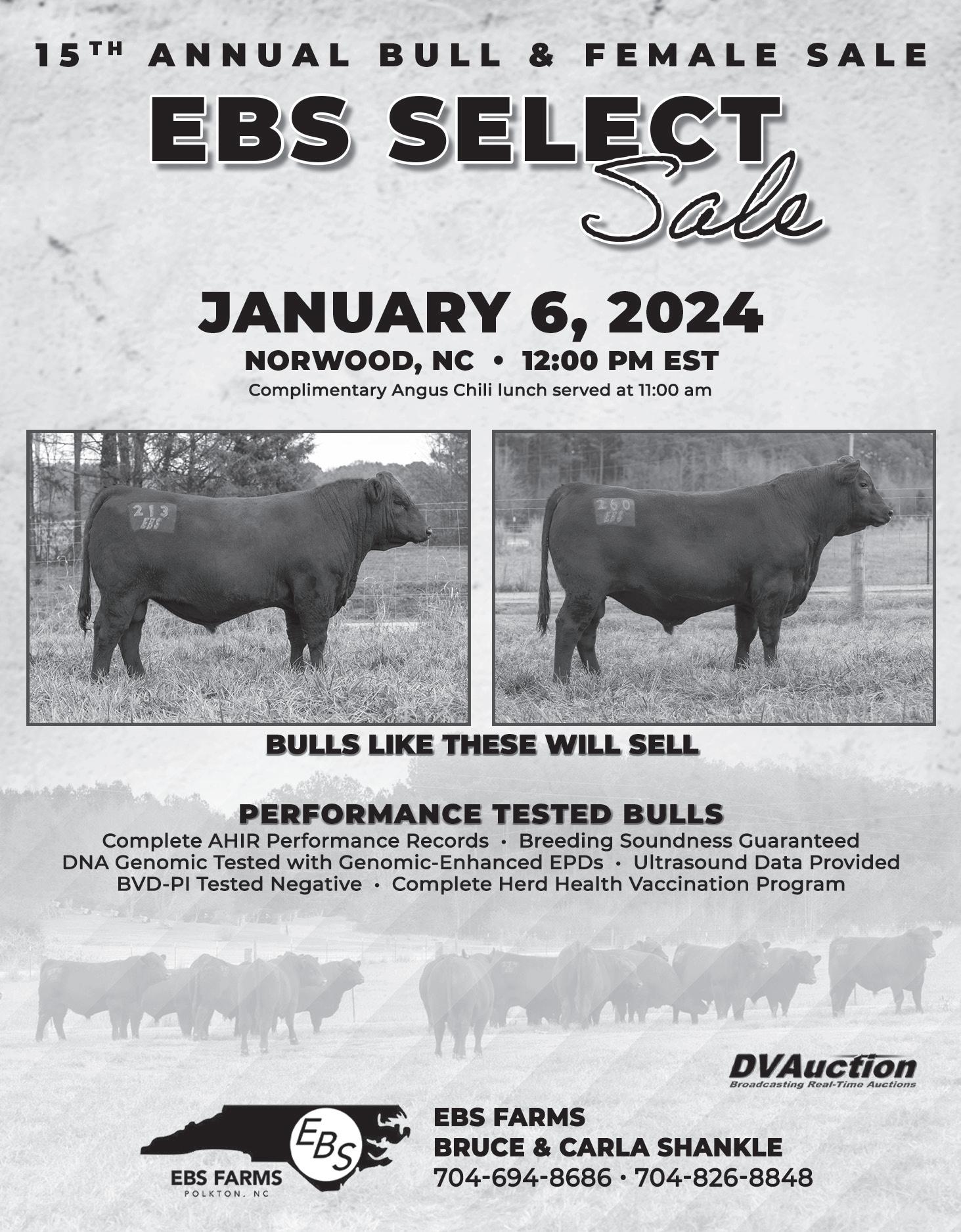 Jan. 6 — 15th Annual EBS Select Bull & Female Sale, Monroe, N.C.