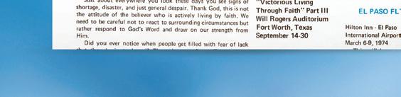 In September 1973, in obedience to those instructions, Kenneth Copeland Evangelistic Association Inc. published its first official newsletter: a four-page, two-color publication called Believer’s Voice of Victory: “A newsletter for the Power People.” It was distributed to about 3,000 people.