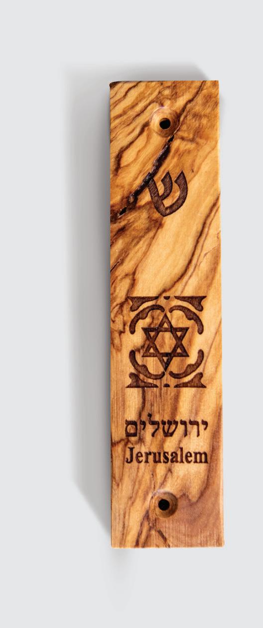 This solid Jerusalem City olive wood mezuzah is made in Israel. Scroll included. Between 4.5" and 5" tall.