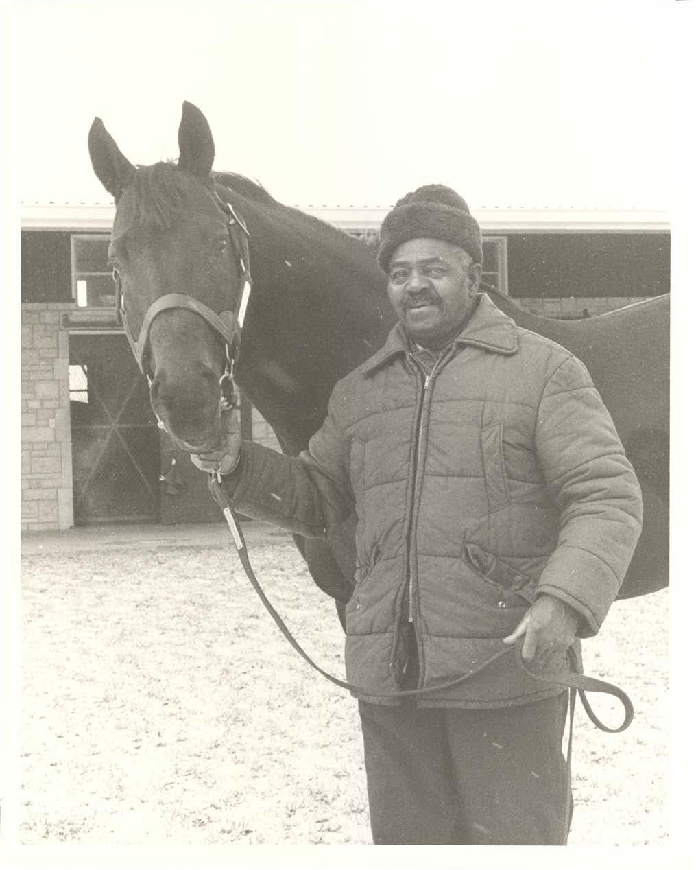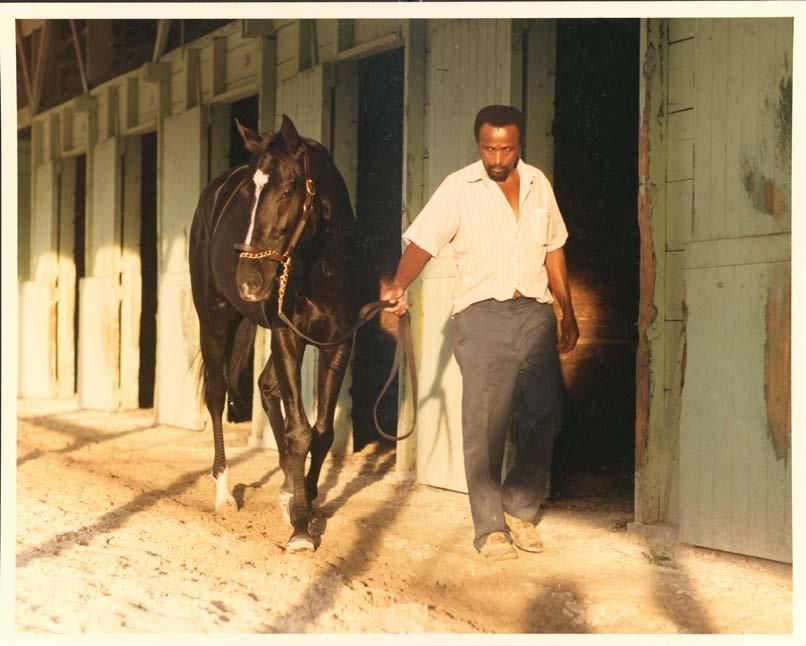 BORN IN 1938 in Holly Hill, South Carolina, Eddie Sweat left his family’s tenant farm in high school after future Racing Hall of Fame trainer Lucien Laurin offered him a job. Sweat traveled the racing circuit for much of his life, working as a hot walker, horse van driver, and groom for Lucien and then his son, Roger Laurin. While Secretariat, Sweat’s brilliant charge, rose to greatness and captivated the nation before and after his 1973 Triple Crown win, the horse’s many connections also made headlines. As a pair, Sweat and Secretariat were inseparable in the public eye and on the backside. Sweat shouldered the horse’s daily care, from mucking shedrow stalls at 4:30 every morning to tending to his needs around the clock, bunking nightly in a nearby tack room.