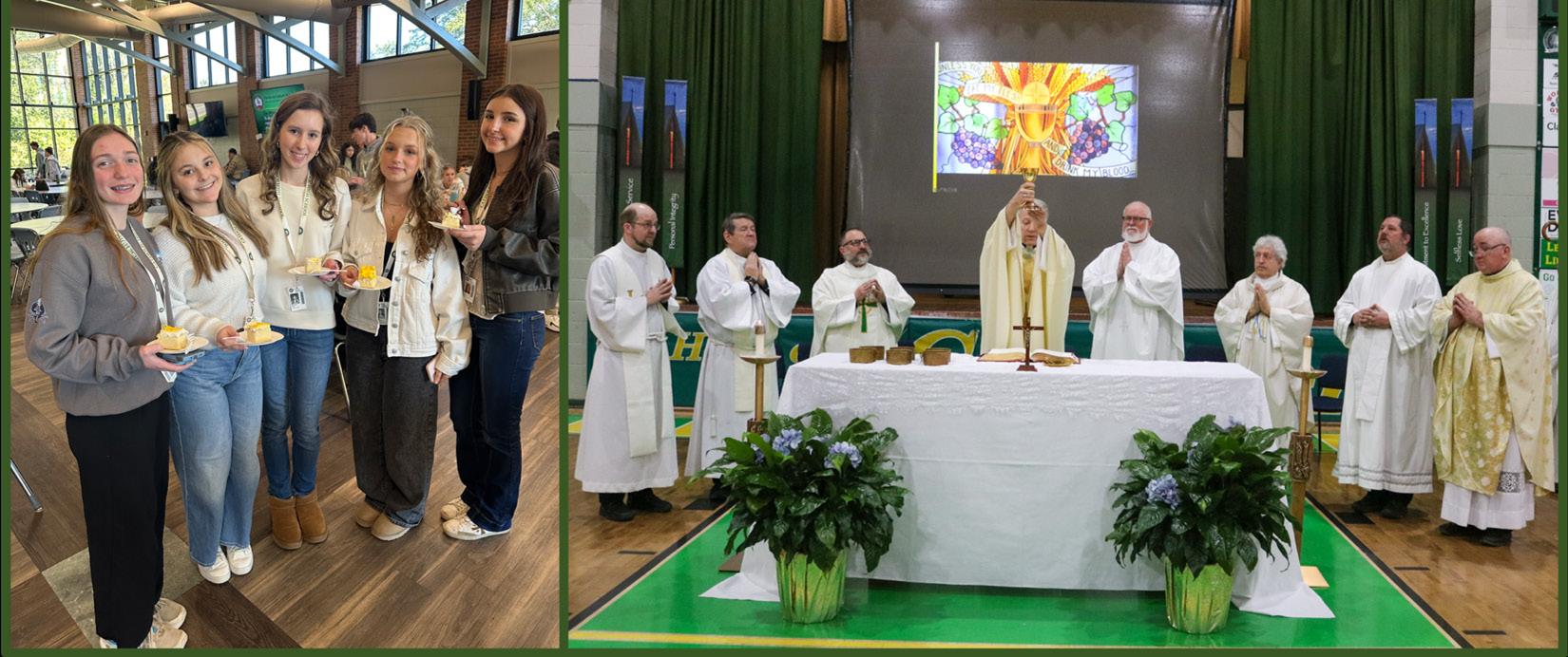 The first documented Catholic School in North America was established around 1606 by Spanish Franciscans and was located in St. Augustine, Florida. It was not until 1840 that Catholic Schools were first documented in the Pensacola area, and in 1877, before there was continuous Catholic education. There were several Catholic High Schools in the area as far back as 1902, and we know they were all consolidated in the Fall of 1941 to create what we affectionately know as Pensacola Catholic High School. Every year during the last week in January, the nation celebrates ‘Catholic Schools Week’ during which we take time throughout the week to celebrate our heritage as a Catholic School. Principal Sister Kierstin Martin, along with Campus Minister, Rebecca Carter, and the rest of the Religion Department Faculty, collaborate to create an agenda of activities that focuses on a different aspect of Catholic education on each day -- students, volunteers/parents, faculty, community, and history. Special prayers, lessons, and fun activities help to make the week memorable. On Wednesday, Bishop William Wack was joined by seven other priests from the Diocese to celebrate Mass in thanksgiving for our wonderful schools in the Diocese, including Pensacola Elementary Schools St. John’s School, Little Flower School, St. Paul’s School, Sacred Heart Cathedral School, and the Mother Clelia Morning Star High School. CHS students, as well as student representatives and faculty from each of these schools, participated in the Mass. Everyone enjoyed the week, participating in the planned events and experiencing gratitude for everyone who makes Pensacola Catholic High the special place that it is! Pictures show students after receiving a piece of cake on Student Appreciation Day and Bishop Wack with other celebrants during the Catholic Schools Week Mass.