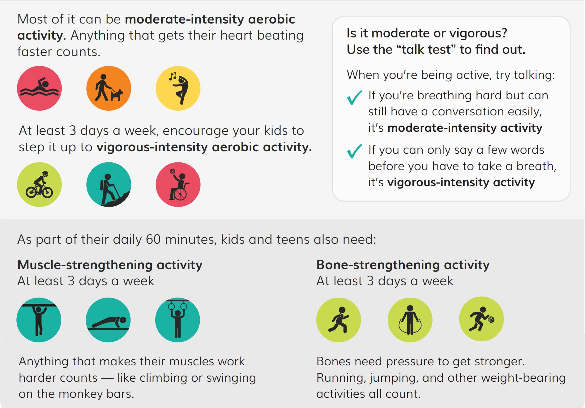 Kids and teens ages 6 to 17 need at least 60 minutes every day.