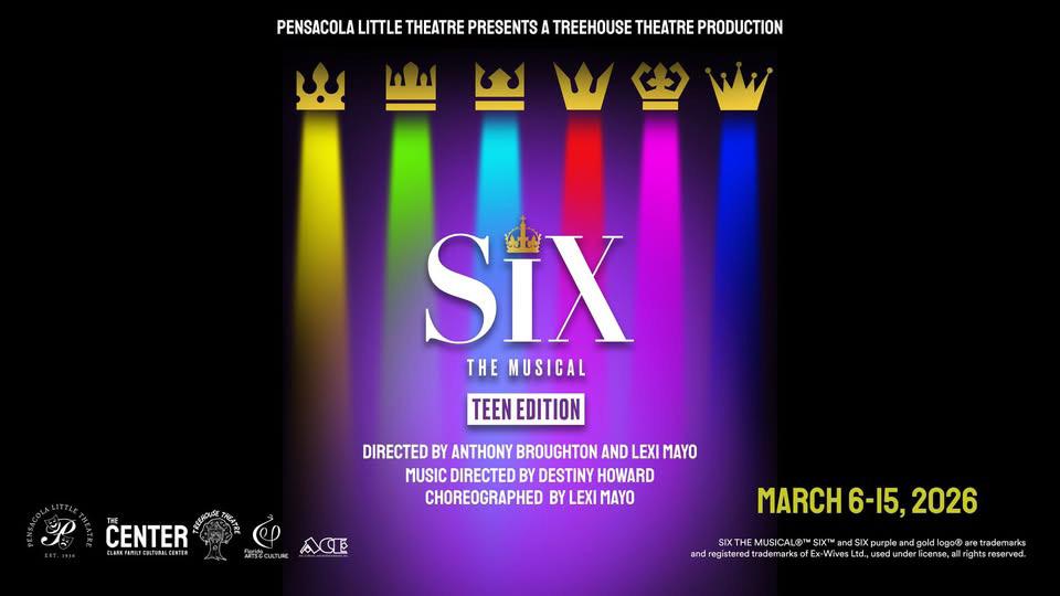 Pensacola Little Theatre presents SIX: Teen Edition, March 6-15, 2026. Get ready to remix history with SIX: Teen Edition, the electrifying pop musical that reclaims the spotlight for the six wives of Henry VIII. In this high-energy, concertstyle show, each queen takes the mic to tell her story—her way—through catchy songs, fierce choreography, and a girl-power attitude. Equal parts history lesson and pop concert, SIX: Teen Edition, is a celebration of resilience, sisterhood, and finding your voice. Please visit https://www.pensacolalittletheatre.com/shows-and-events/six-teen-edition for more information.