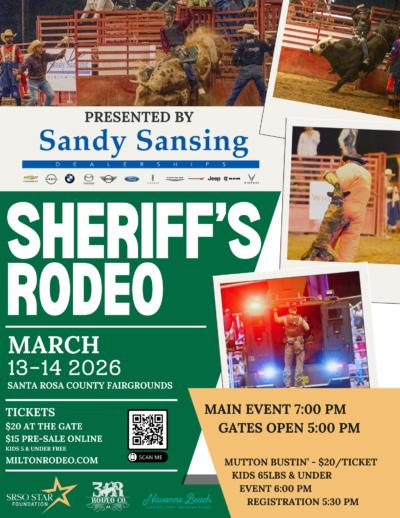 Join us for a family-friendly evening packed with heart-pounding rodeo riding, jaw-dropping K-9 and SWAT demos, and other experiences, all in support of the SRSO Star Foundation. This event on March 14-15, 2026, at the Santa Rosa County Fairgrounds, directly benefits the brave men and women of the Santa Rosa County Sheriff’s Office, ensuring they have the resources they need to serve and protect our community. Please visit https://srsostarfoundation.org/uncategorized/ sheriffs-rodeo-2/ for more information.