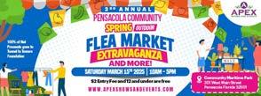 Come on out to the Spring Pensacola Community Outdoor Flea Market Extravaganza on Saturday, March 15 from 10am until 5pm at Community Maritime Park. Entrance fee is $2 and children 12 and under are free. 100% of Net Proceeds goes to Tunnel to Towers Foundation. Food trucks will also be on site. Please visit https:// apexshowsandevents.com/ for information.