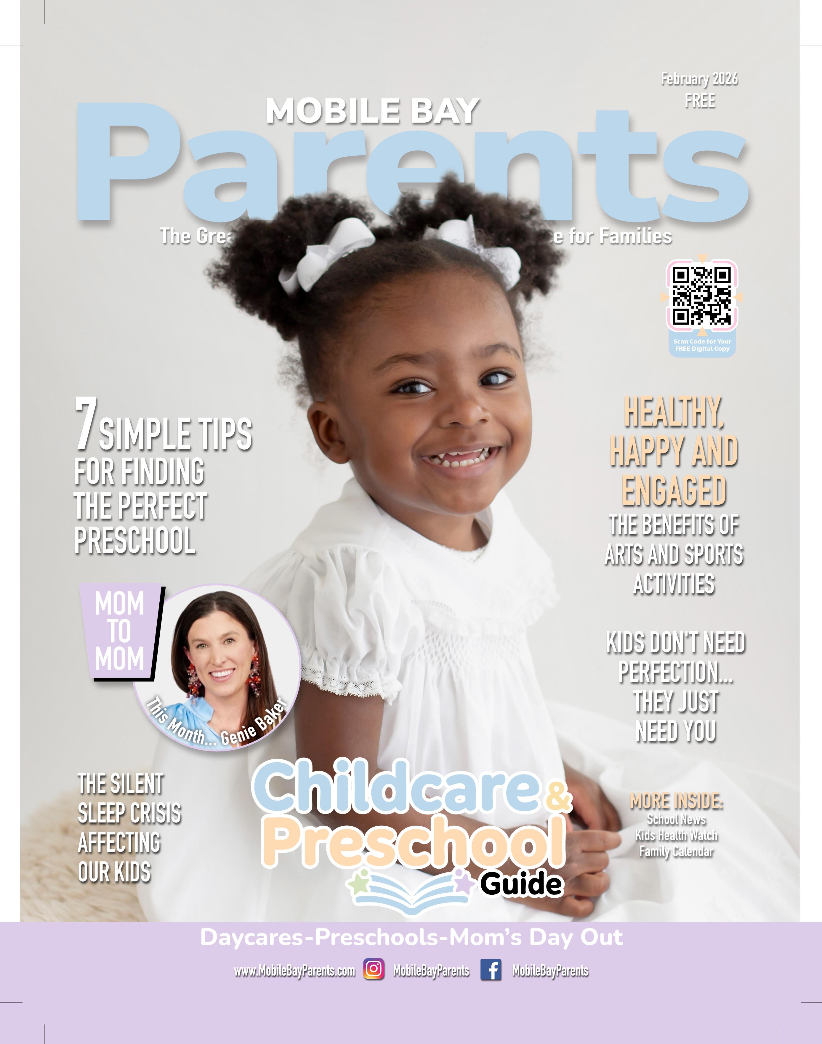 Mobile Bay Parents magazine is published monthly by KeepSharing, LLC. Mailing address: P.O. Box 81105, Mobile, Alabama, 36689. The phone number for voice and fax is (251) 304-1200. Mobile Bay Parents is copyrighted 2026 by KeepSharing LLC. All rights reserved. Reproduction in whole or part without written permission is prohibited. Opinions expressed in Mobile Bay Parents magazine are those of the authors and do not necessarily reflect he view of the owners, nor do they constitute an endorsement of products and services herein.