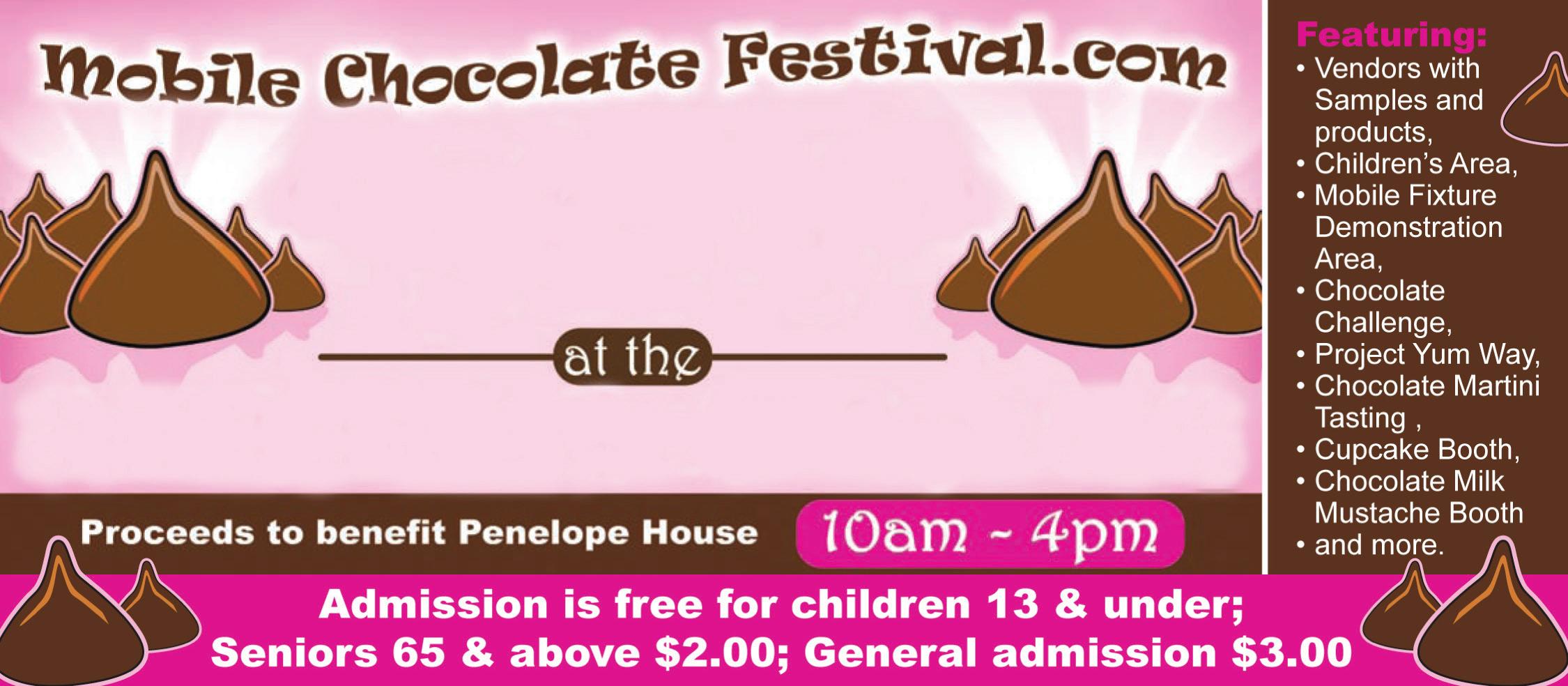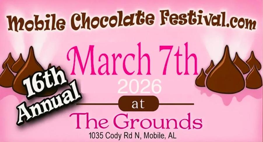 The 16th Annual Mobile Chocolate Festival, a celebration of all things chocolate, will be held at The Grounds on Saturday March 7, 2026 from 10:00 a.m. until 3:00 p.m., with all proceeds to benefit Penelope House. There will be vendors offering samples of their chocolate-related products as well as selling their products. Vendors vary from having chocolate-themed wares to succulent confections to jewelry to bath and body products. Also free activities featured: Children’s Area, Mobile Fixture’s “Decorate Your Apron” Booth, Cupcake Booth, Chocolate Martini tasting, Fishing Booth, and Magic Memories Photo Booth; enjoy live music, Chocolate Challenge featuring professionals, amateurs, and youth divisions, Project Yum Way where students and aspiring designers participate in a fashion display of chocolate inspired fashions made from chocolate candy wrappers. Admission is $10.00 for ages 12 and up; $5.00 for children ages 4-11 and free for ages 3 and under. Please visit www.mobilechocolatefestival.com and like Mobile Chocolate Festival on Facebook for more information.