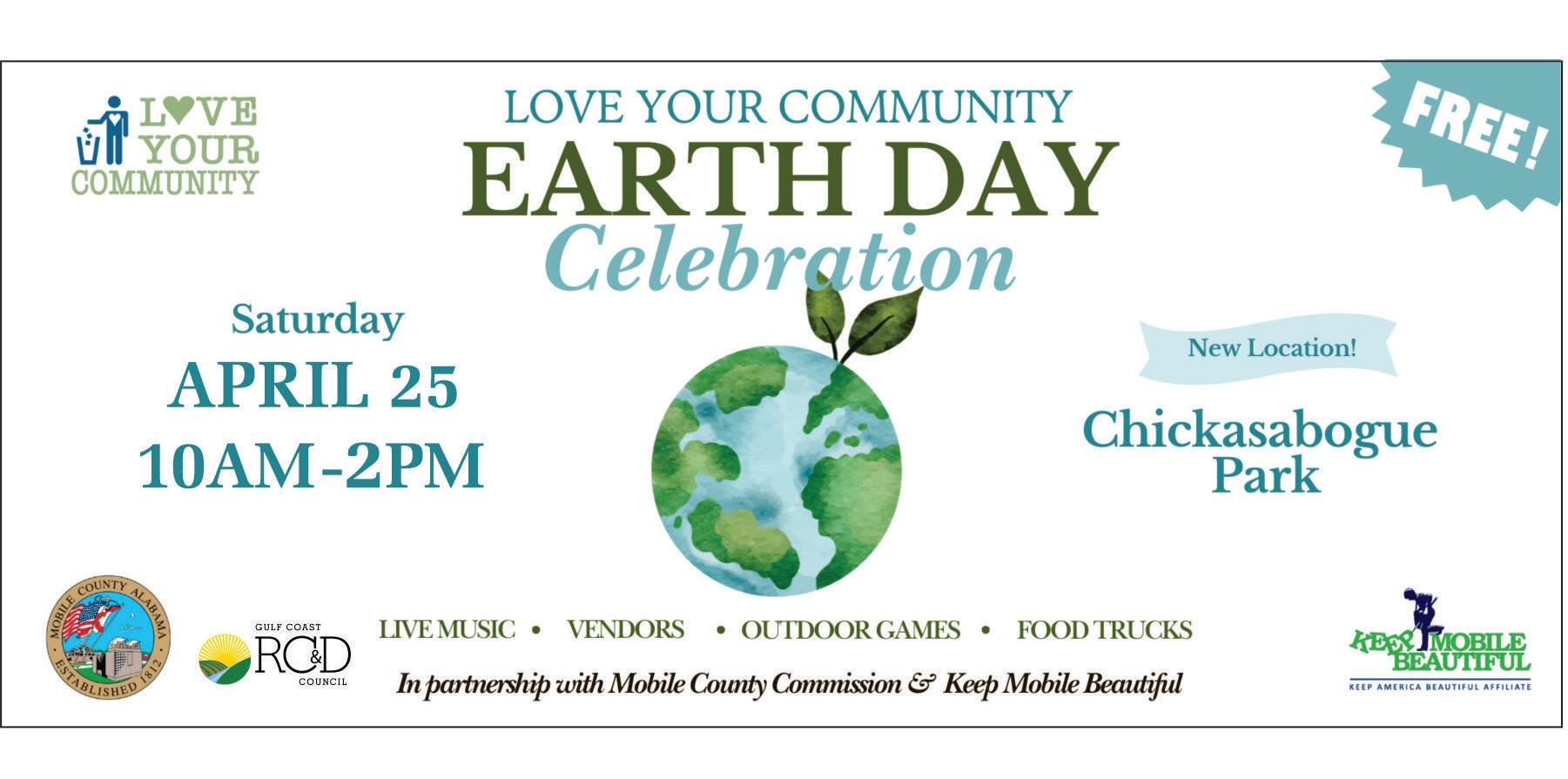10:00 AM - 2:00 PM, Chickasabogue Park, 760 Aldock Road Eight Mile, AL, 36613 Join us on April 25th at Chickasabogue Park for an Earth Day Celebration! From 10 AM - 2 PM, let’s come together for a day of fun and a celebration of our Earth! FREE admission to the public! There will be live music, food trucks, hands-on crafts, vendors, and much more!