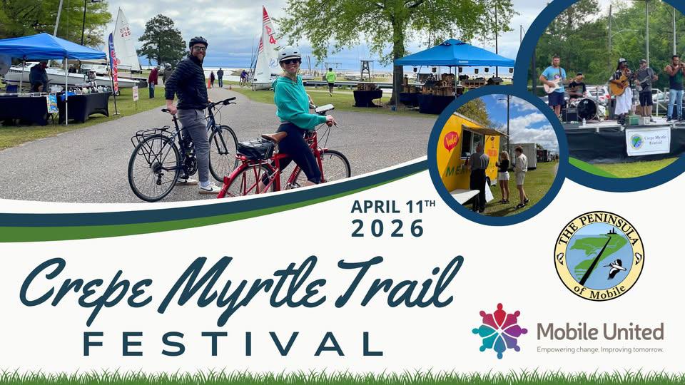 The Crepe Myrtle Trail Festival is a signature annual event where The Peninsula of Mobile teams up with Mobile United to spotlight the beautiful waterfront Crepe Myrtle Bike Trail - starting at McNally Park, traversing the scenic 10.6 miles including the Brookley International Airport and Arlington Park, then circling back to McNally to finish with a big community party. Following the ride, the festival springs to life with live music, local food vendors, kids’ activities, kayak tours, and community partners sharing how we can all support a healthier, more connected Peninsula. The Crepe Myrtle Trail Festival isn’t just a fun day out — it’s a call to imagine and invest in a future where trails, parks, and access to nature are part of everyday life. Our goal is to raise awareness of the Crepe Myrtle Trail’s potential as a major community resource and bring families, neighbors, and visitors together. This year the Crepe Myrtle Trail Festival will be held on April 11th. The group bike ride with Mobile United will begin at 8:30 AM at McNally Park (4380 Park Road, Mobile, AL 36605). Upon return to McNally Park, the afterparty will begin at 10 AM and end at 3 PM. Please visit https://www.peninsulaofmobile.org/crepe-myrtle-trail-fest.