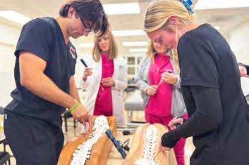Day 2: TRAUMA/ER - Keri Bryant, a trauma nurse with 20 years of experience, led our ER Day. She explained the process for receiving a prehospital report and activating an Alpha Trauma Alert plan. Our students participated in assessing the patient and noted there were stepoffs on the spine at T2, T3, T4, T5, and L1. The patient was prepped, and our students inserted a chest tube (using pork ribs to simulate the patient’s ribs). Imaging results indicate T2-T5 spinous process fractures, L1 burst fracture, left rib fractures 3rd-7th, left scapula fracture, and a left pneumothorax. The patient was moved to the OR.
