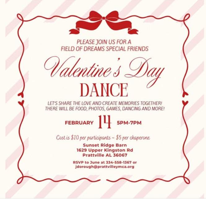 Let’s share the love and create memories together! There will be food, photos, games, dancing and more. Cost is $10 per participant and $5 per chaperone. RSVP to June at 334-558-1367 or jdorough@prattvilleymca.org.