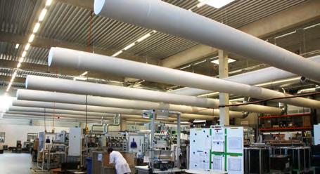 Textile Lüftungssysteme reduzieren den Systemdruckverlust gegenüber stahlbasierten Anlagen, da auf Drosselklappen verzichtet werden kann.