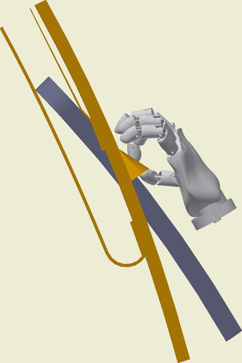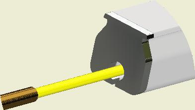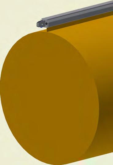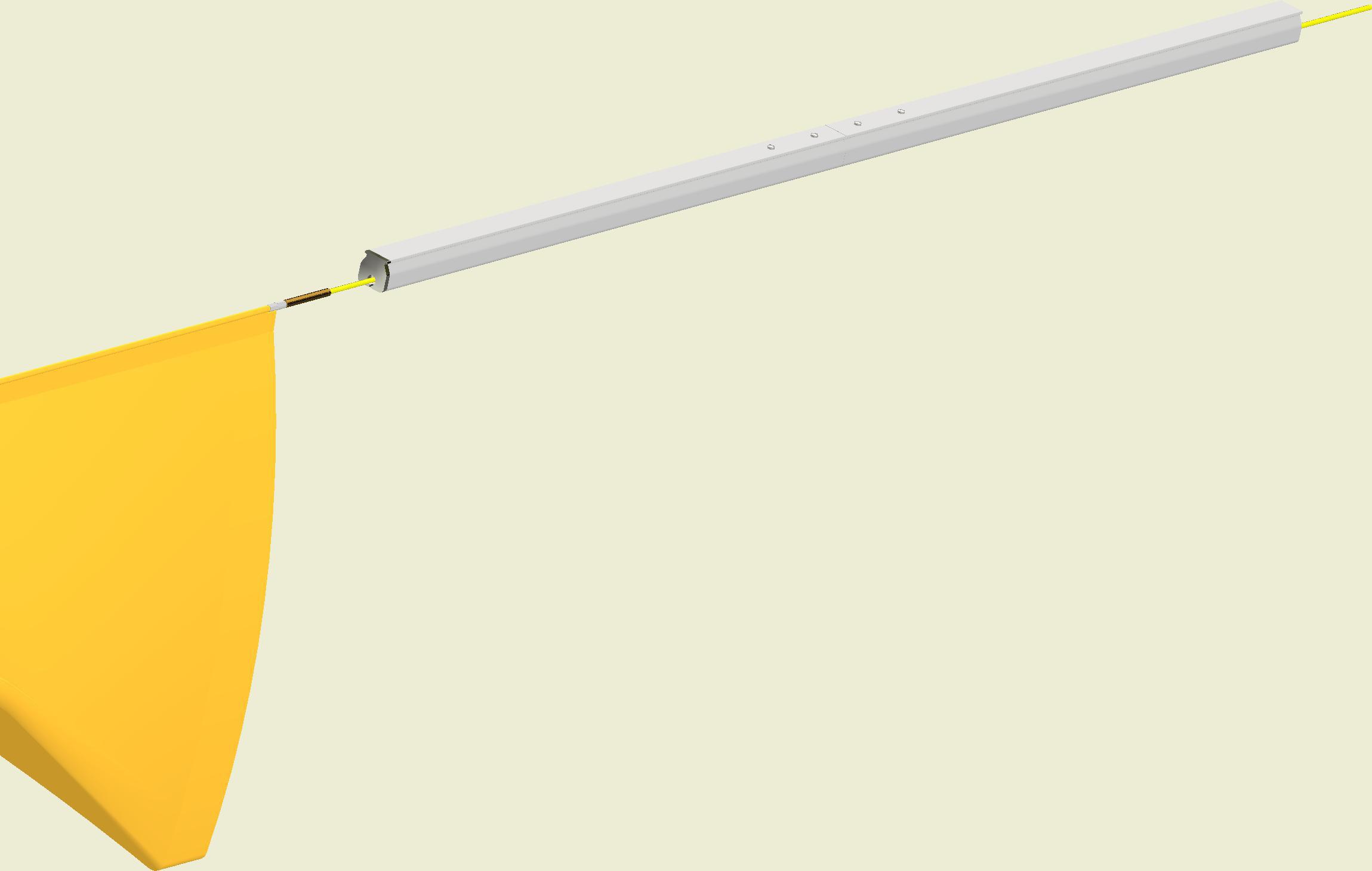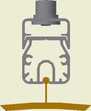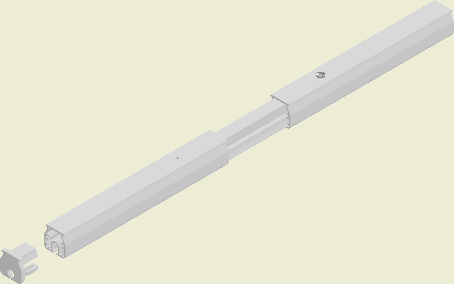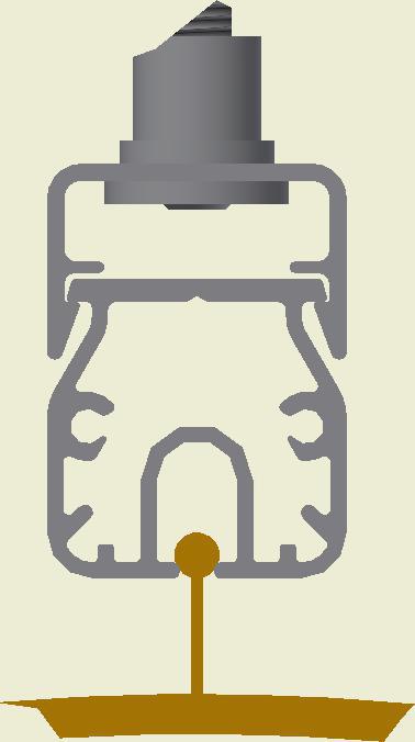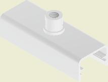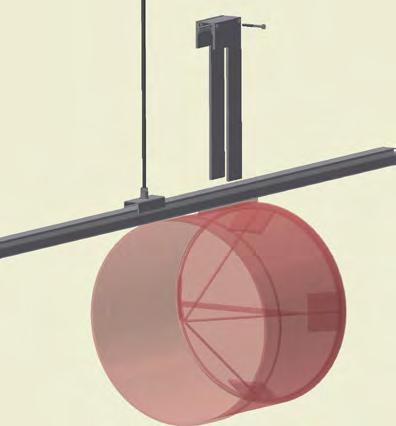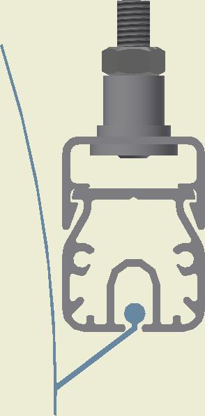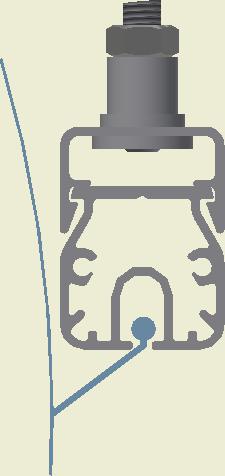 At the end of the duct, lower the SafeStretch Bracket (without the set screw) over the track and into the duct through the 2 slots in the fabric duct section at 12 o'clock, until it "snaps" onto the track. The bracket must be at an angle so one groove sits in place on the rail, and then it can be clicked on. Make sure it is placed so that it is in front of the horizontal strut. Insert the screw, but do not tighten it fully yet, as the bracket still has to be moveable/adjustable.