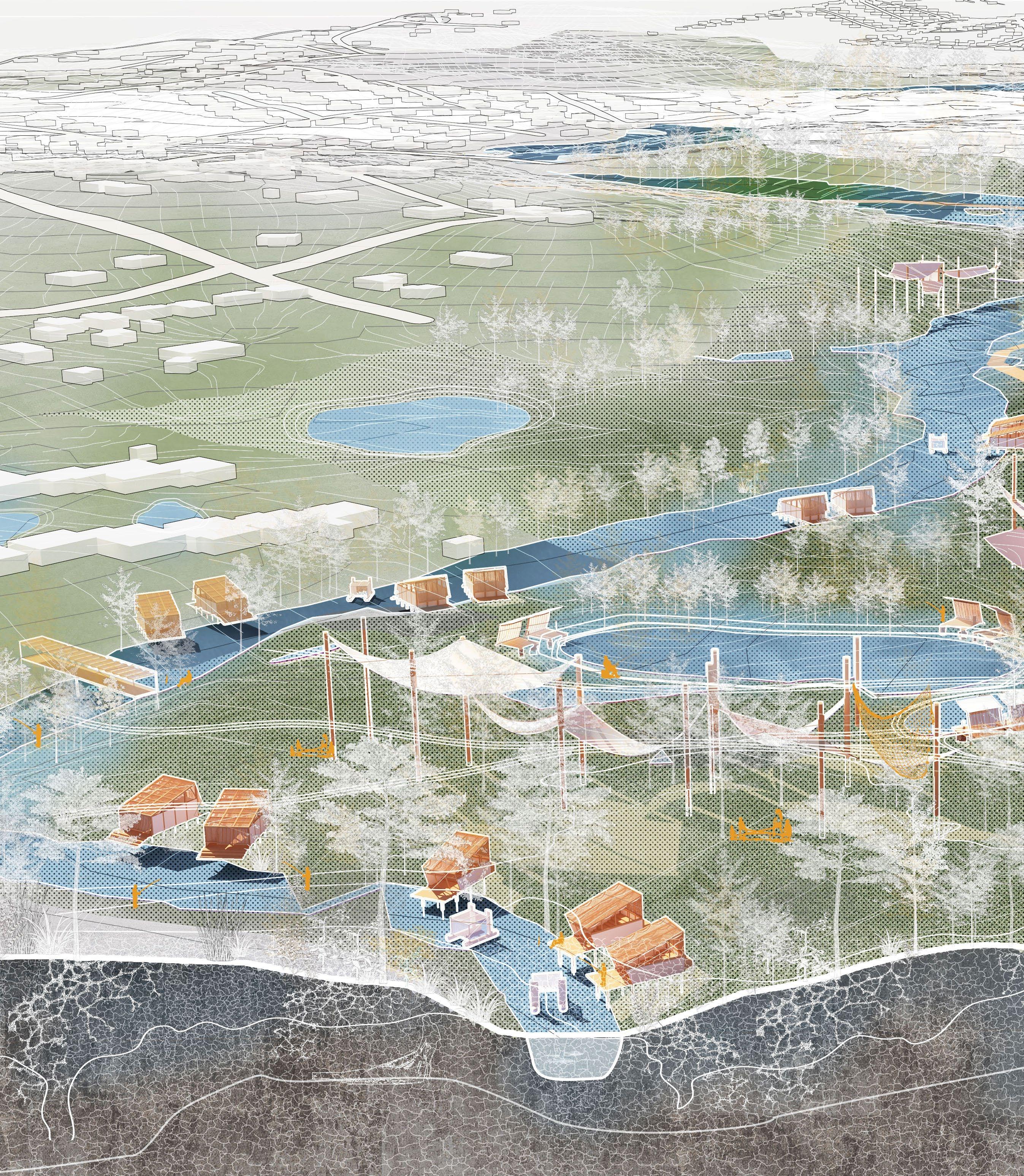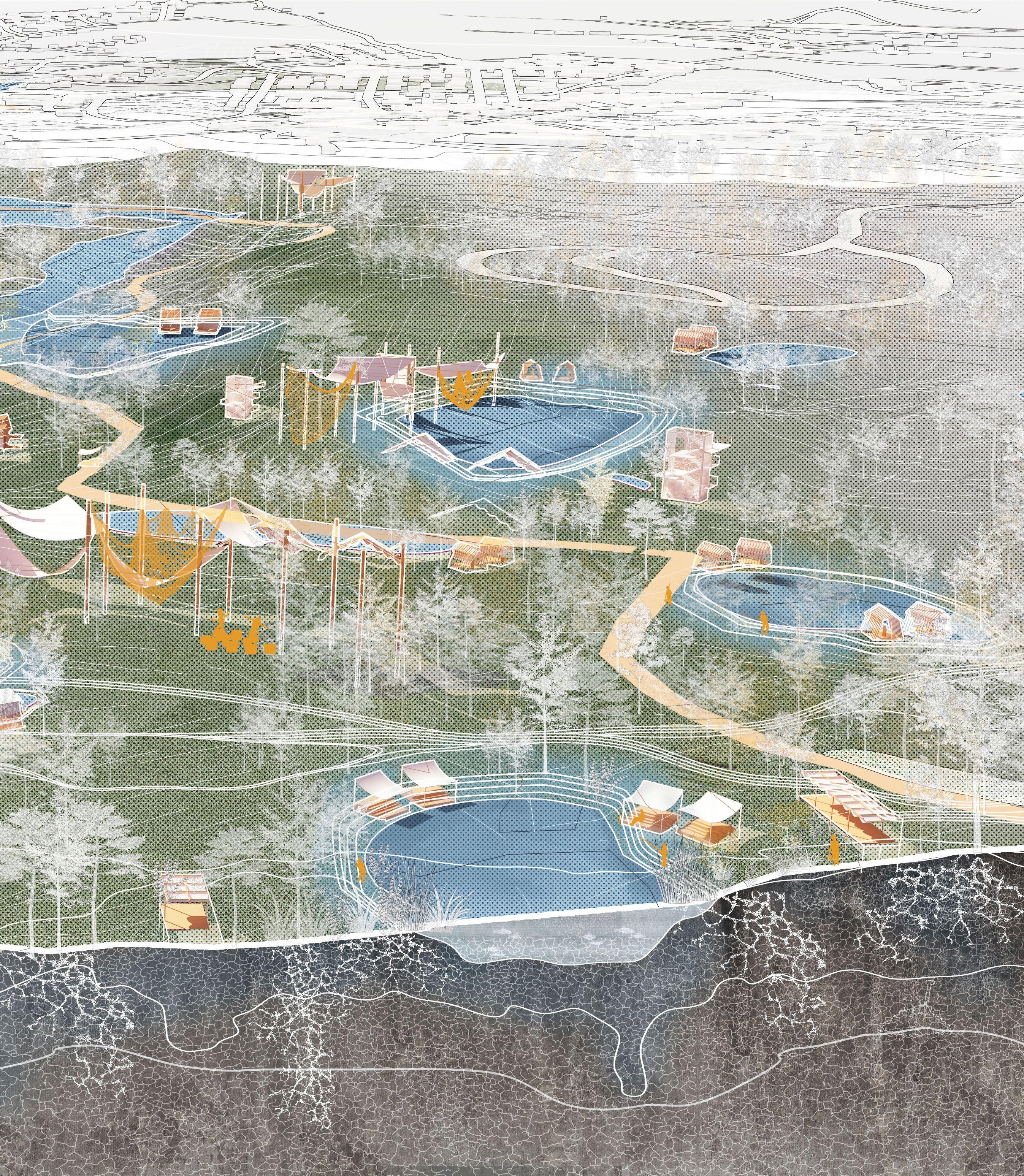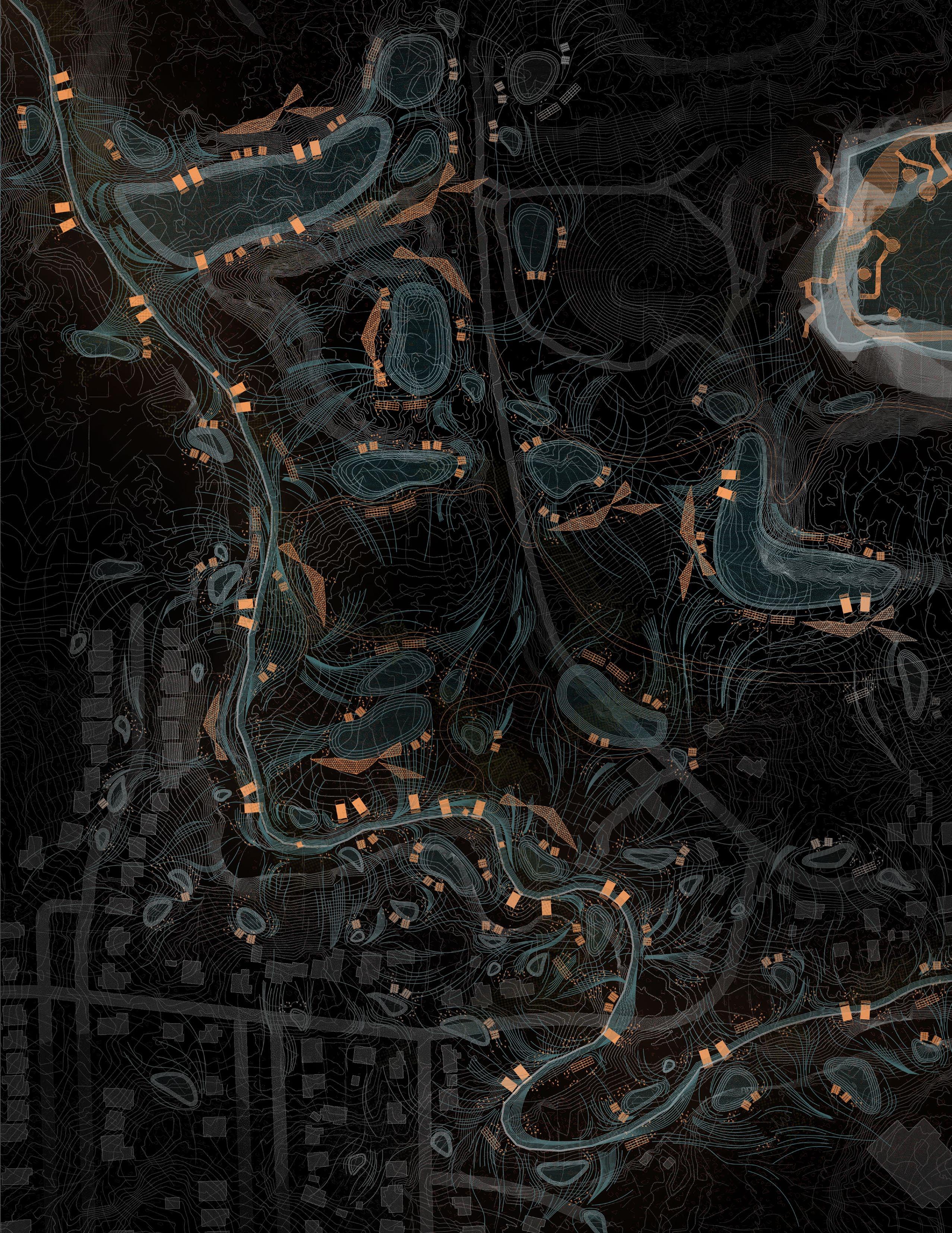 Our appreciation of the cyclic nature of systems translates into a proposal of a series of water bodies, created through shallow excavations by collective effort from the neighborhood, reclaiming the act of excavation. The pools honor the natural ebb and flow of water and allow people to meander closer to the creek and quarry.