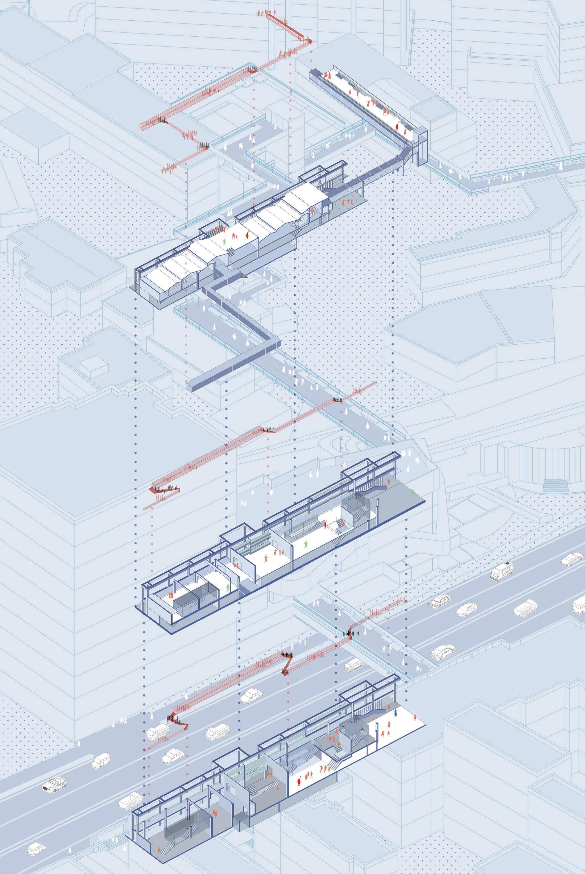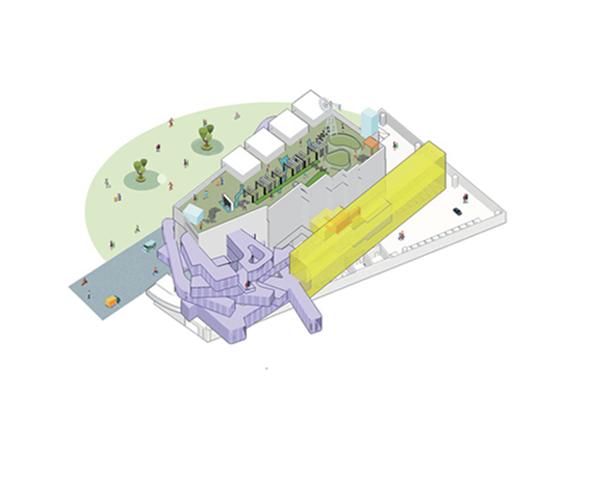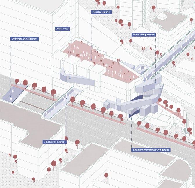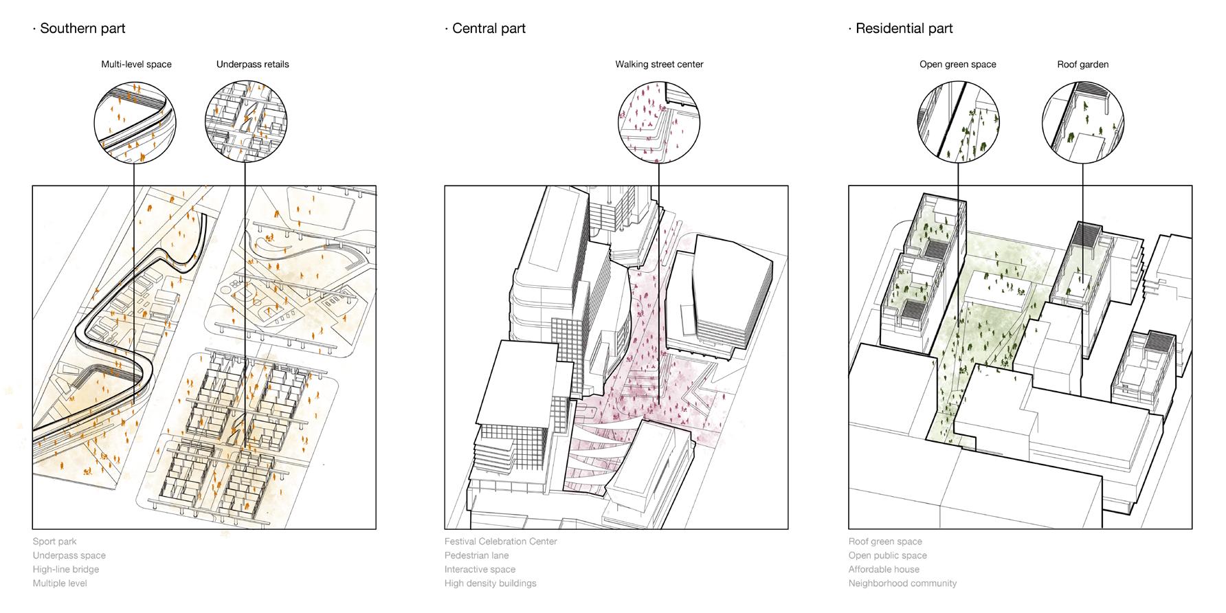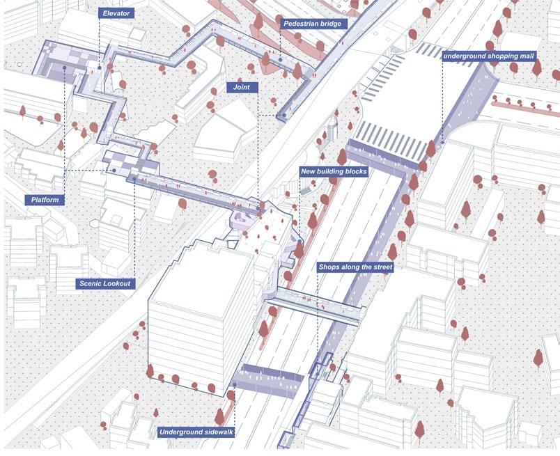 The site space design can be divided into four different types: the underground pedestrian space on the first floor, the ground space containing the transportation network on the second floor, the building structure on the third floor, and the ground track and elevated pedestrian bridge on the fourth floor. These spaces are connected in series through pedestrian passages to form a multifunctional urban complex.