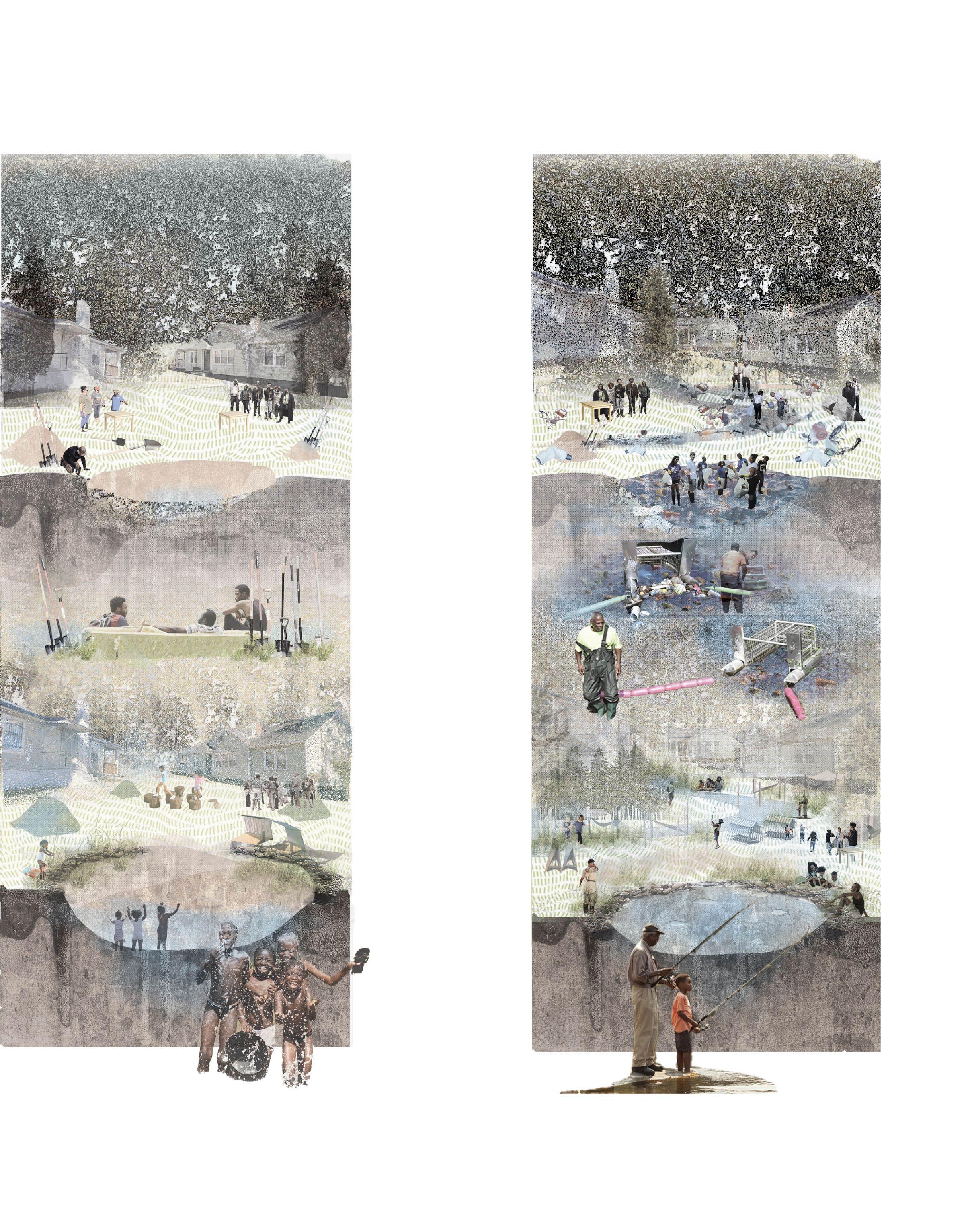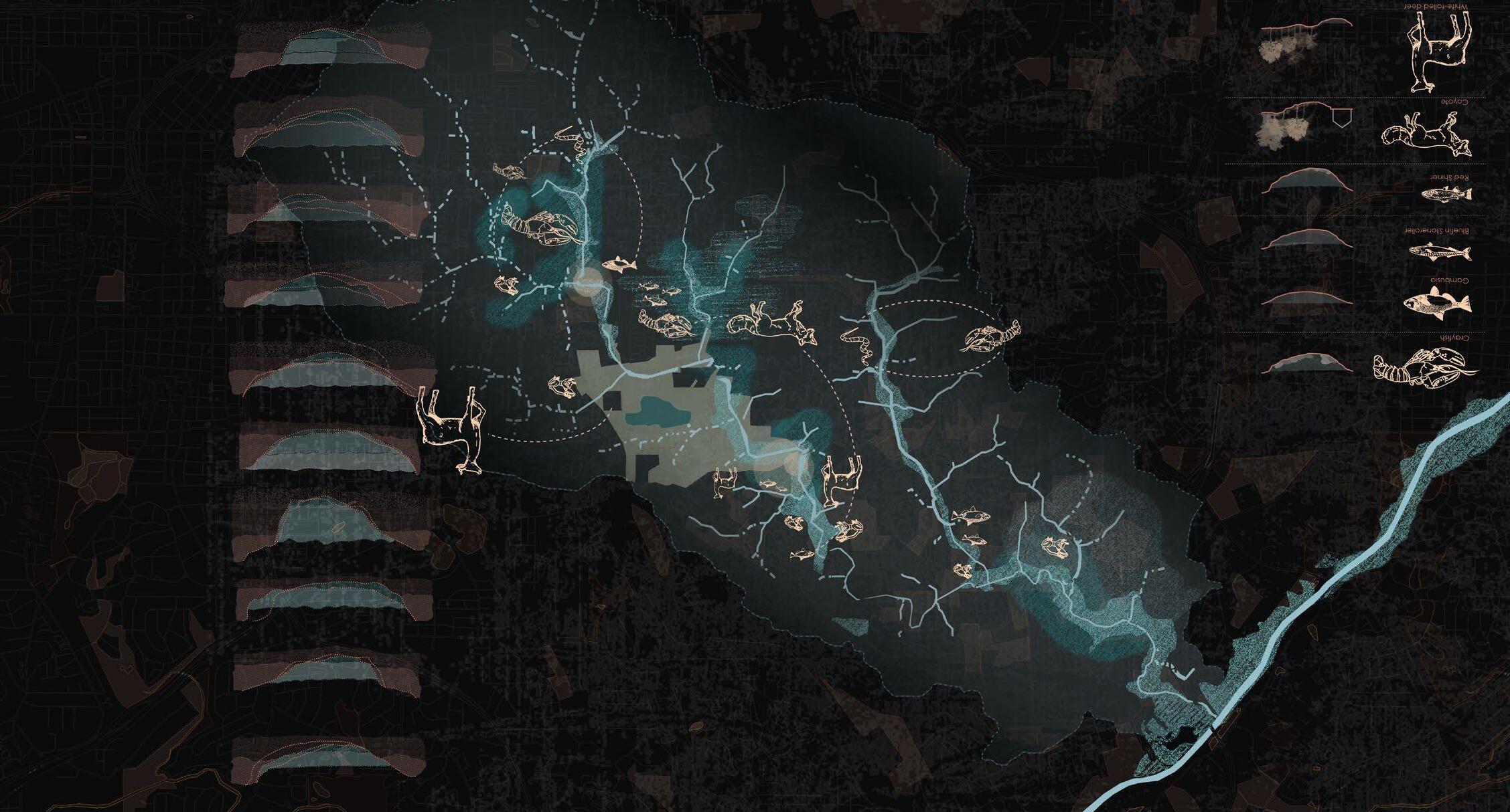 This, along with the natural flow of Proctor Creek, has led static properties to be redefined by the dynamic, leading to ‘property’ itself to be a tenuous notion. After property, we turn to water to redefine demarcated land and bridge the chasms between those stewarding and those interacting with it. Land is shaped by a variety of actors who are a part of the natural ecosystem where man is no longer the primary driver of developing the land. The productivity of these systems determines the value of this land over the previously held notions of monetary worth. Here, the collective responsibility for shaping the land is borne by both human and non-human inhabitants, ushering in collective ownership that honors the interconnectedness of life forms.