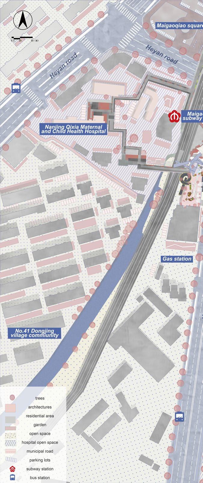 The redesign focus of the Maigaoqiao station area revolves around integrating the existing three hospitals into a future-proof community framework. Key aspects of the renovation design include a three-dimensional traffic organization centered on the Maigaoqiao station, flexible spatial transformations, and the implementation of green corridors to enhance environmental quality.