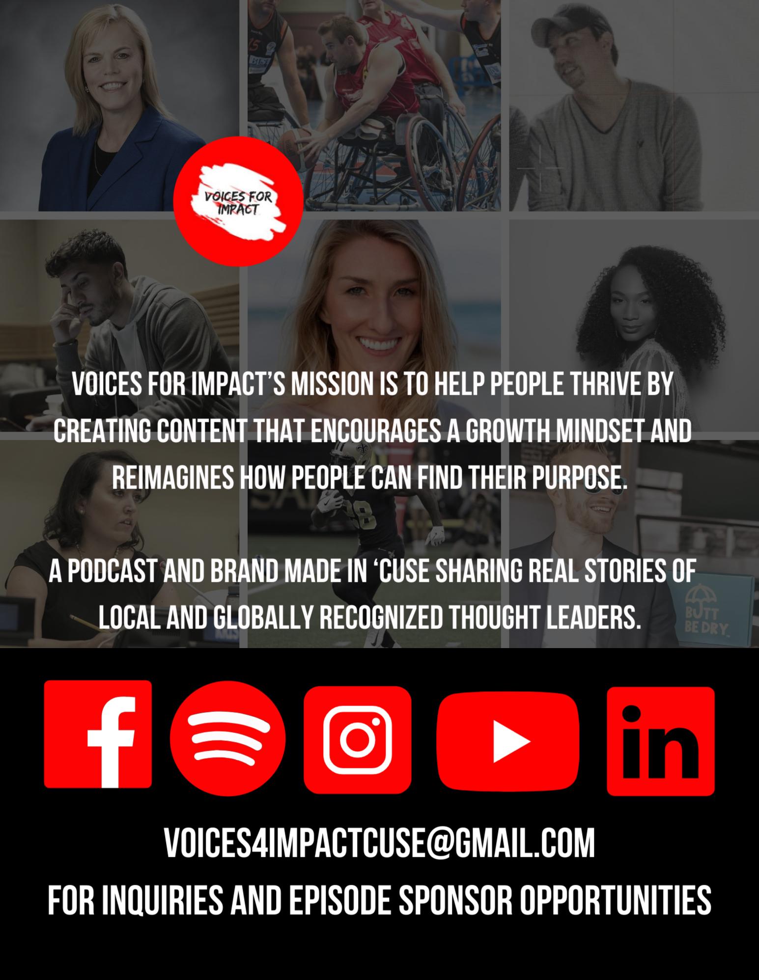Email voices4impactcuse@ gmail.com if you would like to get your message out to a new audience by sponsoring an episode or sharing your story to help encourage people to find their passion and purpose. I’m always happy to meet up for a (socially-distant) coffee!