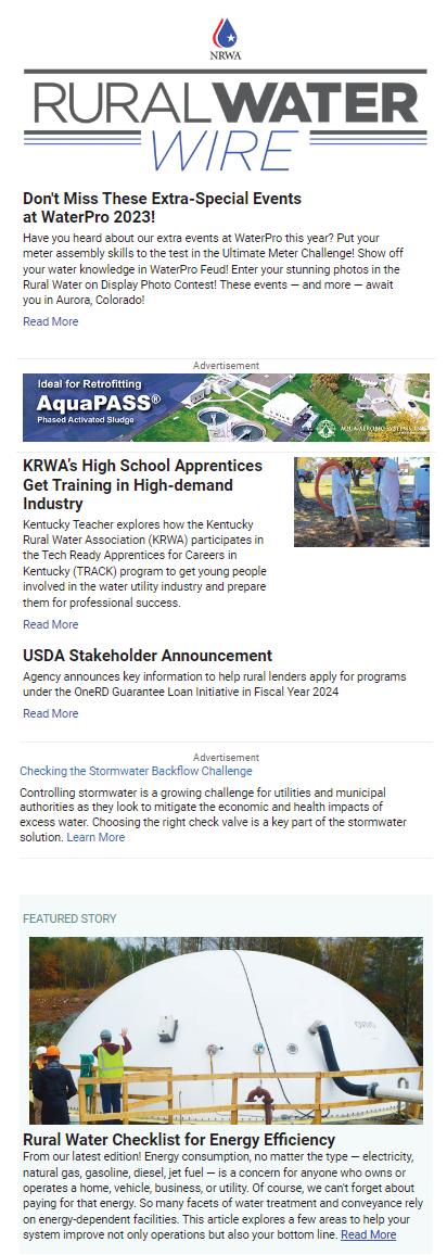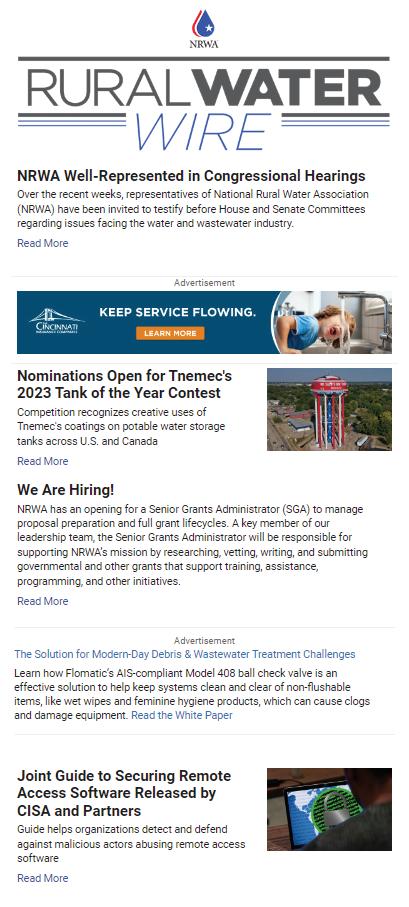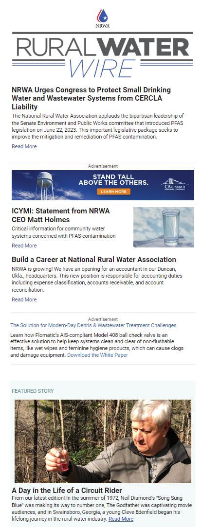 The Rural Water Wire delivers the latest news and information about the water and wastewater industry directly to your email’s inbox each Thursday. Sign up today!