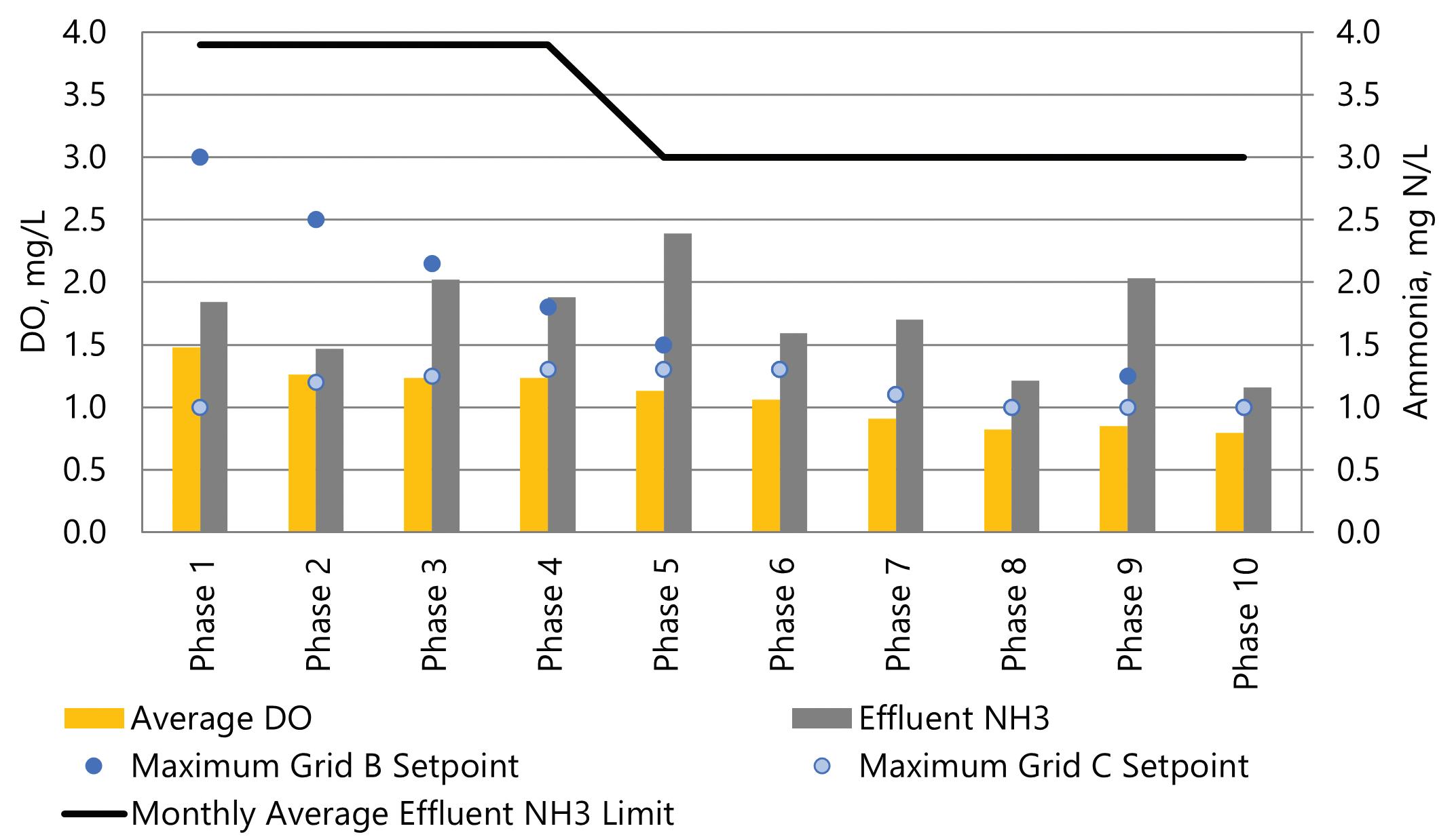 For the low DO transition, ABAC was configured using ammonia setpoints as the primary control variable and DO setpoints as a secondary constraint. The DO setpoints functioned to maintain DO