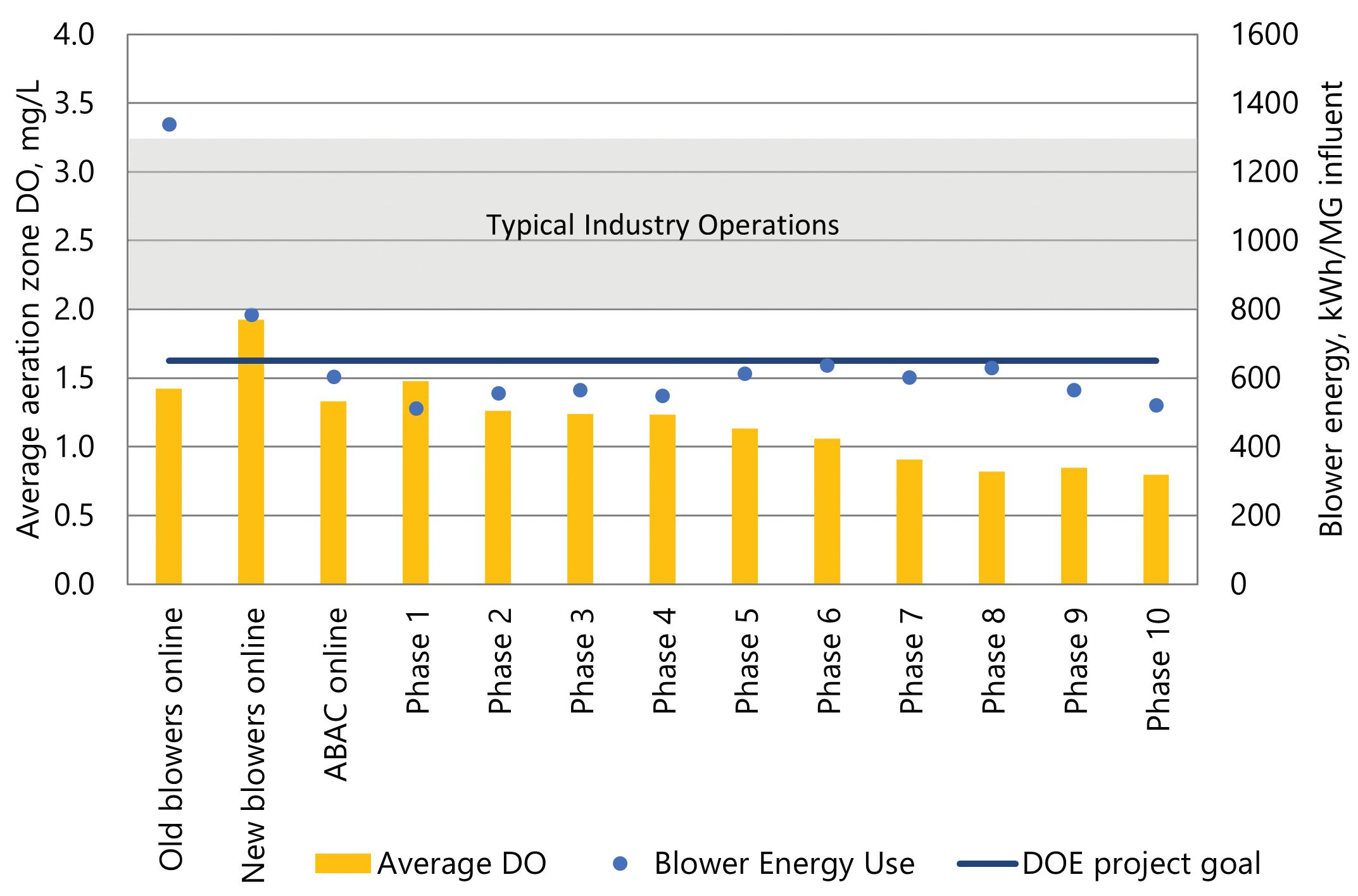 Installing new, more efficient blowers improved energy efficiency by 40 percent, but reducing from a maximum aeration DO of 3 mg/L in Phase 1 to a maximum aeration DO of 1.0 mg/L in Phase 10 further decreased energy usage by 20 percent.
