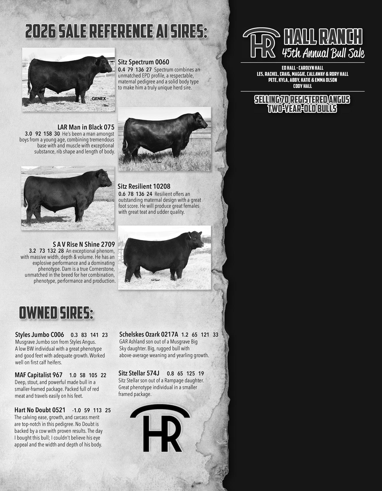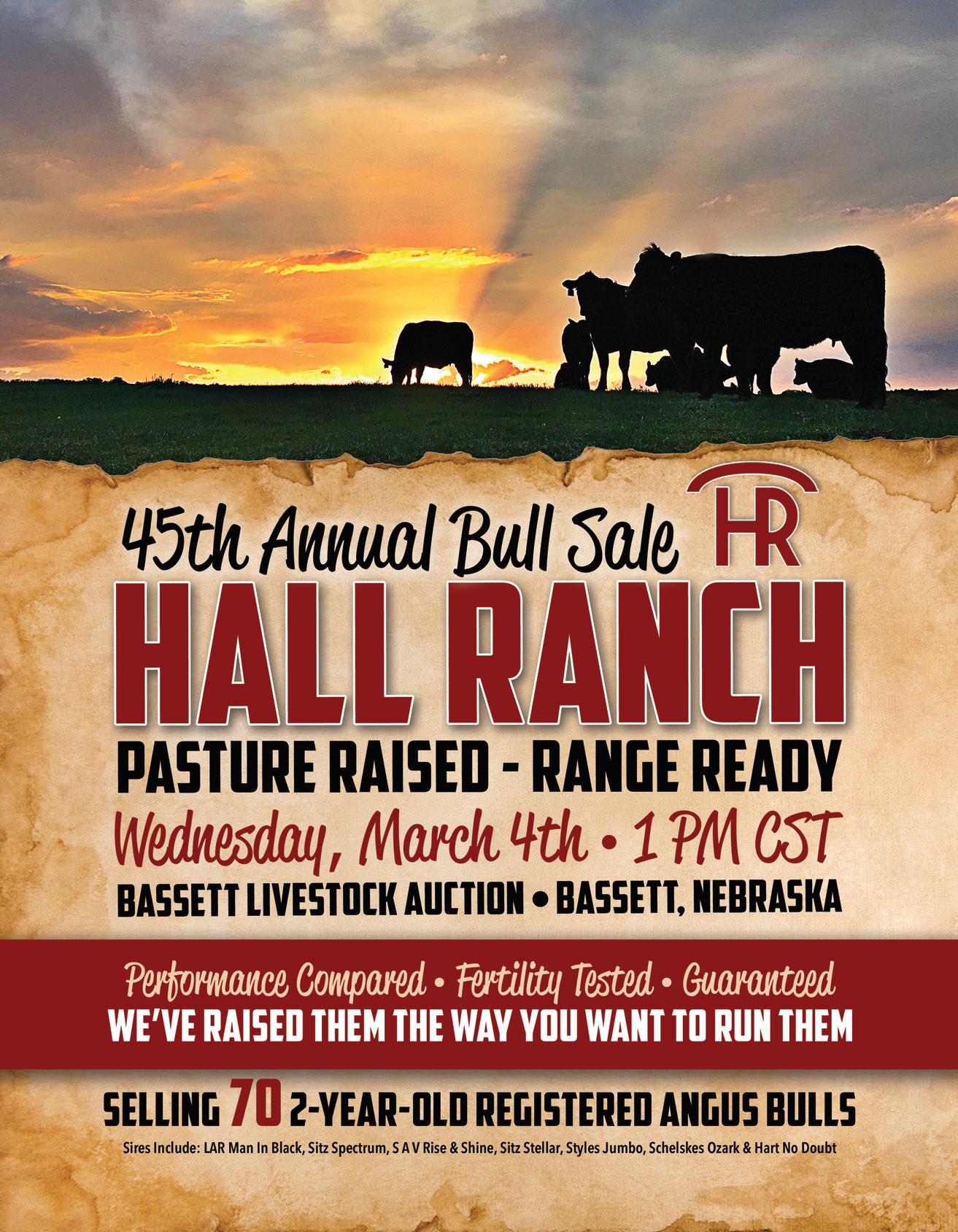 We invite you to review our sale catalog and visit us to see the bulls firsthand, 8 ½ miles north of Bassett, any time. We are here to answer any questions and help you select the genetics that will best fit your operation. We are working with DVAuction again, so you will be able to look at videos in February. Look for links on our website, hallranchangus.com, or on Facebook or Instagram at @hallranchangus1902. If all else fails, the bulls will be in town on March 3rd for your inspection. Thank you for considering our program, and we look forward to seeing you at the sale.