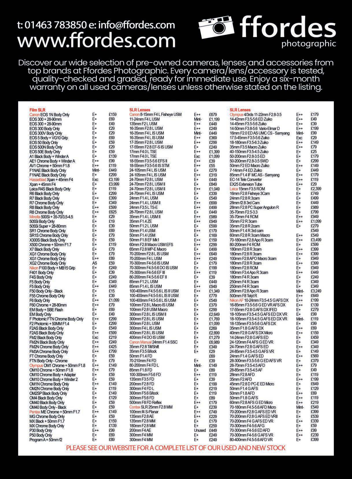FUJI X DIGITAL USED X-T2 body ..........................................£499 10-24 F4 XF R box...........................£349 16 F1.4 WR box. ...............................£499 16-80 F4 WR...£449 18 F2 R ........£299 18-55 F2.8/4 XF ...............................£299 23 F1.4 XF.......£399 35 F2 XF WR£279 50-140 F2.8 WR box .......................£999 50-230 F4.5/5.7 MKII ......................£239 55-200 F3.5/4.8 R box ...................£399 56 F1.2 R ............................................£449 60 F2.4 R mac ...................................£299 100-400 F4.5/5.6 WR box .............£899 1.4x XF conv .....................................£299 X500 flash.....£299 EF-42 flash ......£99 OLYMPUS MICRO 4/3 USED OM-1 body Mint box...................£1199 E-M1 MKIII body box .....................£699 E-M10 body box..............................£349 7-14 F2.8 Pro.....................................£699 8-25 F4 Pro..£749 9-18 F4/5.6 .....£299 12-40 F2.8.....£399 12-45 F4 Pro £399 12-100 F4 ...........................................£799 12-200 F3.5/6.3 box .......................£599 17 F1.2 Pro...£599 30 F3.5 mac .£149 40-150 F2.8 Pro box ...........................£799 40-150 F4......£649 40-150 F4/5.6 £149 45 F1.2 Pro box................................£599 60 F2.8 macro box..........................£379 75-300 F4.8/6.7 MSCII ...................£379 PANASONIC MICRO 4/3 USED G9 body box..£499 BGG9 grip .....£99 G7 body .............................................£299 GH4 body ..........................................£399 7-14 F4...........£399 8 F3.5 box ....£399 8-18 F2.8/4 box ...............................£629 12-60 F3.5/5.6 ..................................£299 14-42 F3.5/5.6 .....................................£99 14-45 F4/5.6......................................£149 25 F1.4 box .......................................£299 35-100 F2.8 MKII box.....................£599 42.5 F1.2 DG .....................................£599 45-175 F4.5/5.6................................£299 45-200 F4.5/5.6 box .......................£179 100-300 F4/5.6 MKII .......................£349 SONY DIGITAL USED A1 body box ...................................£4499 A9 MKIII body box ........................£4499 A9 MKII body..................................£2499 A9 body box ...................................£1499 A7R MKV body box ......................£2699 A7R MKIV A body box .................£1999 A7 MKIV body box .......................£1699 A7 MKIII body.................................£1199 RX10 MKIV box ..............................£1199 RX10 MKIII .........................................£699 VG-C4 EM grip box.........................£299 VG-C3 EM grip box.........................£129 Sony F60M flash box .....................£299 Sony F58AM/F43/F56AM each ..£149 SONY FE MOUNT DIGITAL USED 12-24 F2.8 GM box .......................£1999 16-35 F4 ZA box ..............................£599 24 F1.4 G box ...................................£799 24 -70 F2.8 GM II box ..................£1699 24-70 F4 ZA OSS box.....................£399 24-105 F4 G OSS box.....................£799 35 F1.4 ZA OSS box........................£599 35 F2.8 box..£299 50 F1.2 box £1399 50 F1.4........£1199 55 F1.8 box ..£399 85 F1.4 G ............................................£999 90 F2.8 G OSS macro .....................£699 100 F2.8 GM OSS box....................£899 100-400 F4.5/5.6 OSS D box .....£1399 135 F1.8 box ...................................£1299 GITZO CF TRIPODS/HEADS USED GT1545T + GH1382QD GT1555T + 82TQD ..........................£399 GT3531S........£499 GT3541LS.....£499 GT3542..........£499 GT5532S .......£499 GT5540LS ..........................................£599 G2220 Explorer ................................£199 GHF3W ...............................................£299 G2380 video head box .................£229 GH2750QR ........................................£199 GH3382QD ........................................£299 GH3750QR head .............................£299 GH3780QD head.............................£299 GH5380SQR head ...........................£299 GS3750 DQR panoramic head ...£149 CANON R MIRRORLESS USED R3 body box ...................................£3499 R5 body box. ..................................£2699 R6 body box ...................................£1199 R body box.....£599 RP body ......£499 RF 14-35 F4 L IS USM box ..........£1199 RF 15 -30 F4.5/6.3 IS STM box ....£479 RF 15-35 F2.8 L IS USM box ......£1699 RF 18-45 F4.5/6.3 IS STM box .....£249 RF 24 F1.8 STM macro box ..........£499 RF 24-70 F2.8 IS USM box ..........£1999 RF 24-105 F4 L IS...........................£1099 RF 50 F1.2 L USM box .................£1699 RF 70-200 F4 L IS box ..................£1299 RF 100 F2.8 L IS USM macro .....£1099 RF 100-500 F4.5/7.1 L IS USM...... £2399 RF 200-800 F6.3/9 IS USM box .£2099 RF 600 F11 IS STM box .................£599 RF 800 F11 IS STM box .................£699 5D MKIII body ..................................£599 90D body box. .................................£899 80D body box ..................................£399 760D body ........................................£369 650D body ........................................£299 BG-E20/16/14/13/11/9/8 grip ea .£99 CANON M MIRRORLESS USED M50 MKII + 15-45 box...................£499 M3 + 15-45 F3.5/6.3 IS STM ........£199 EF-M 11-22 F4/5.6 IS STM ............£249 EF-M 15-45 F3.5/6.3 IS STM ...........£79 EF-M 18-150 F3.5/6.3 IS STM ......£349 EF-M 32 F1.4 STM box ..................£429 EF-M 55-200 F4.5/6.3 IS STM ......£249 EF-M adapter.......................................£89 AF LENSES USED 10-18 F4.5/5.6 IS STM EFS ...........£149 L USM box.....................£1399 15-85 F3.5/5.6 EFS ..........................£199 16-35 F4 USM IS L box ..................£599 17-40 F4 L USM ...............................£299 