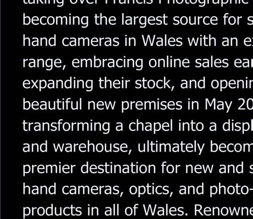 As a thank you to the many customers who have supported us during these fabulous years, we are planning a series of promotions and giveaways throughout 2024, so be sure to keep checking our website... WWW.MIFSUDS.COM for full details. Remember too that we have the West Country’s best selection of used & new stock.... DIGITAL (DSLR / Mirrorless) ~ FILM (35mm-6x7)