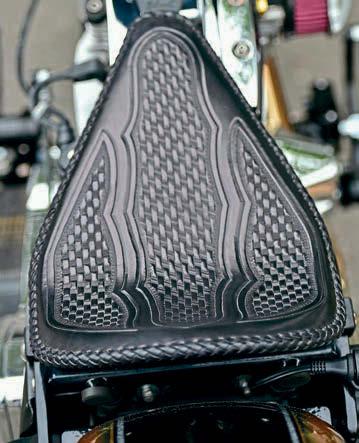 reassuringly expensive (unless you’re as brass as I am, in which case they’re more ‘depressingly’ than ‘reassuringly’) ISR calipers from the Swedish brake maestros in… umm, Sweden. ey’re tted to a solid (as in ‘non- oating’) Ultima front disc, and an ISR sprocket/brake rear (that word ‘sprotor’ makes me shudder), and mean that this Harley (of which there isn’t much, if any at all, Harley in its make-up), already seriously lighter than a stock 1340, Evo or Shovel, stops signi cantly better. too. Just about everything else bar the Zodiac Fat Bubba (great name, eh?) forks and yokes, the Performance Machine master-cylinders (clutch and front brake) and switches, the motogadet mo-unit electrical gizmo in the loom, and the West Coast Choppers oil tank and battery box (which the frames come with as standard) has been handmade in the almost un ndable El Lobo workshop. e headlight, for example, is a complete one-o , beautifully and intricately engraved by Dewa, as is the tank with its dished sides. e seat (pan) was made by them, with an airbag system underneath to try and soak up some o’ the bumps (I’ve told you before, I think, that East Anglia’s roads’re o cially regarded as the most piss-poor, surface-wise, in the land), and it was covered in beautiful handcarved leather by Jun Takakuda who, apparently, has something to do with Barnsley… Mmm, yep, good old Barnsley name that, isn’t it, Takakuda?