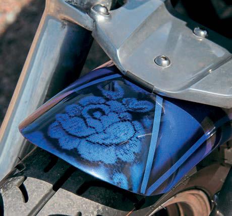“We cover a lot of ground riding to runs from Scotland, and the main problems I’ve had’ve been from vibration. e old sissy-bar, made from tube, kept breaking at the same spot – on a recent run to the Isle of Wight I had to use an old butter knife, cable ties and ga er tape to splint it (Mike Hendry, whose black n’ blue GSX was in BSH a while ago, has since made me a new one from solid bar, which even I’ll have trouble breaking). On another run, to Sussex, the rear mudguard cracked where it’s been cut back to clear the drive chain. We took it to bits on the eld, and spot-welded it to stop the crack travelling any further – it still needs repairing properly, but that’s going to mean new paint at the same time.