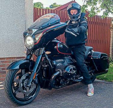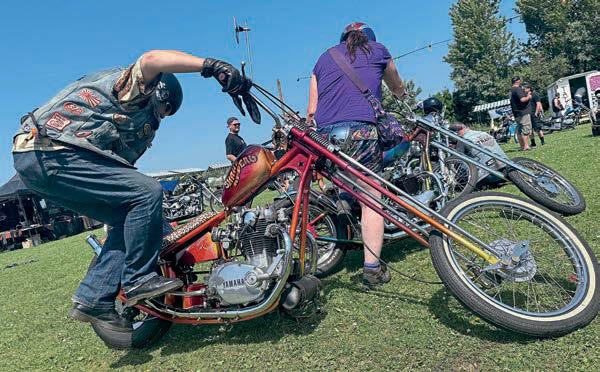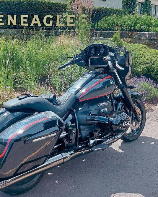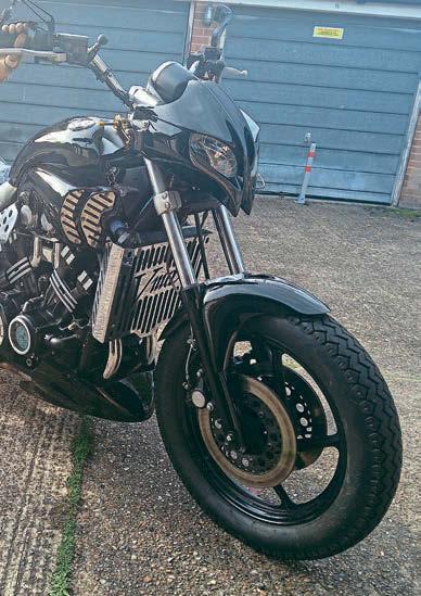He bought his chop from one of the Irish crew that we’ve done a bit with over the last few years, detailing their long trips, rough camping, on choppers round Ireland and Scotland, Johnny Angus who, sadly, passed away late last year. at was in August 2024 and, since then, the pair of them, Gav and the digger, have racked the sort of mileage that most chop riders do in a lifetime. ere’ve been a few problems along the way, he says, but it’s a one-o chopper, isn’t it, not a factory-built, purpose-designed touring bike, but we’ll come to them in a moment. When Johnny got the bike way back when, it was a conventional, if nice enough, GSX-R chop with a (possibly) stretched Sportster tank, a single seat, and an understated paint job, and it was he who turned it into a digger. Somehow, somewhere, he found a gen-u-wine (as our Colonial cousins’d drawl) Rocket tank from the maestro that was Arlen Ness, unavailable, unless you’re really lucky, for years, modi ed it to t, and dropped it on in place of the Sporty, changed the rear mudguard, and a few other parts, too, had a new, larger, seat made by Leather Annie, and then got his son, Chris, to paint the bodywork in a very traditional ligree (also known as lacework) style black over blue. He rode it for a while, and then sold it to Gav eighteen months or so ago. Despite it having a tank range only marginally more than a modern bike’s reserve, it hasn’t stopped him riding it on Club runs, and I’ll let him tell you a little of some of the more memorable ones.