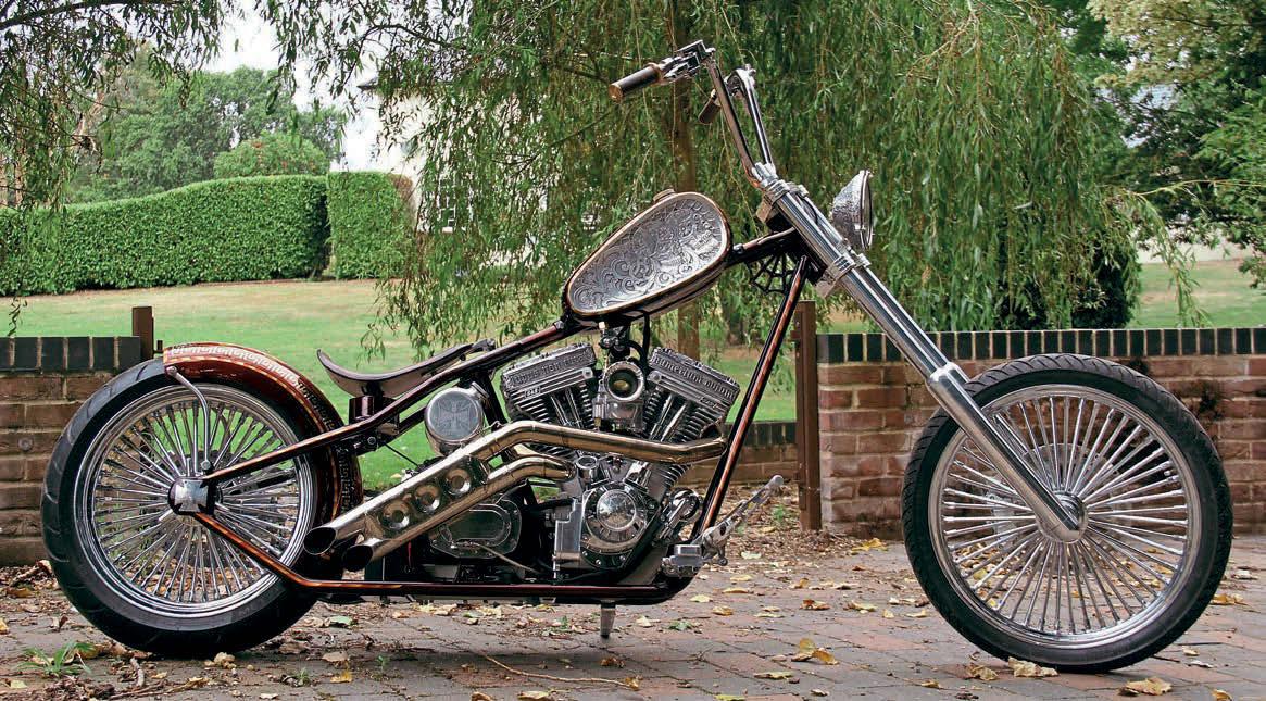 is particular CFL bike was built by the crew at El Lobo Cycles just outside Ipswich in Su olk (you may remember their stainless steelframed swingarm Pan/Shovel from the cover of issue 496 last year), and is based around a rst-generation (CFL1) frame with 38 degrees of rake, and a four-inch stretch upwards and a two-inch stretch rearwards (various rakes and stretches, both up and out, were available) and, with its dished-sides tank, multi fat-spoke wheels, engraving, apes, and minimal seat, it’s a classic design chopper the likes of which we don’t see too o en in these retro-chopper days.