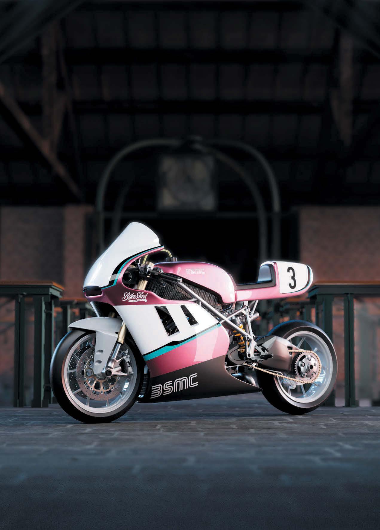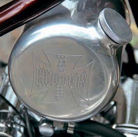 e heart of it is, indeed, an S&S engine – a Sidewinder Evo’ (Sidewinders were/are high performance engines designed to look like either Evos or Shovels) of 80 cubic inches (1340cc) capacity, and it’s mated to an Ultima six-speed ’box with racier ratios than a stock ’Arley’s. e carb’s from the same people who made the engine itself, S&S, and is a Super E with a bell-mouth so large that, if it were to be mounted on the le , it’d be hoovering dogs and small children o the pavements as it passed by. ere’s an open Ultima two-inch belt connecting the engine and the ’box, and the engine, barrels and heads’ve been Cerakoted by LA Coatings across the border in Norfolk, while the rocker boxes’ve been masterfully engraved, along with a few choice others parts (including the tank, which we’ll come to later), by Dewa at SkullsNation Custom Jewelry & Metal Engraving in Indonesia – a place that’s hardly just round the corner from Ipswich, is it? Incidentally, Cerakote, in case you don’t know, is a specialised, polymer-ceramic composite coating that can be applied to metal, plastic, wood and polymers to provide superior corrosion, chemical abrasion and heat resistance, that’s widely used in the rearms industry for protection and nishing, and also, somewhat oddly, is apparently a construction material for light-sabres, according to the video game Star Wars Jedi: Fallen Order… Mmm, LA Coatings’ve kept that part of their business quiet, haven’t they?