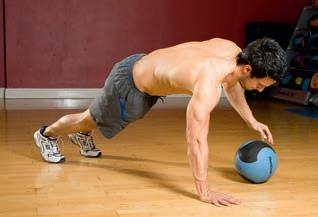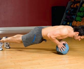 The medicine ball adds wobble to a diamond press-up, forcing the stabilising muscles in your core and shoulders to work harder.